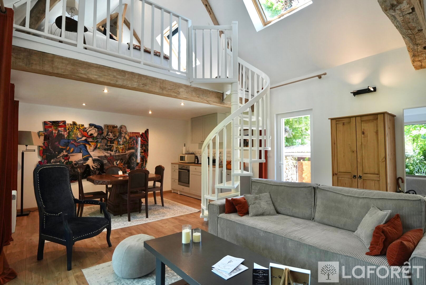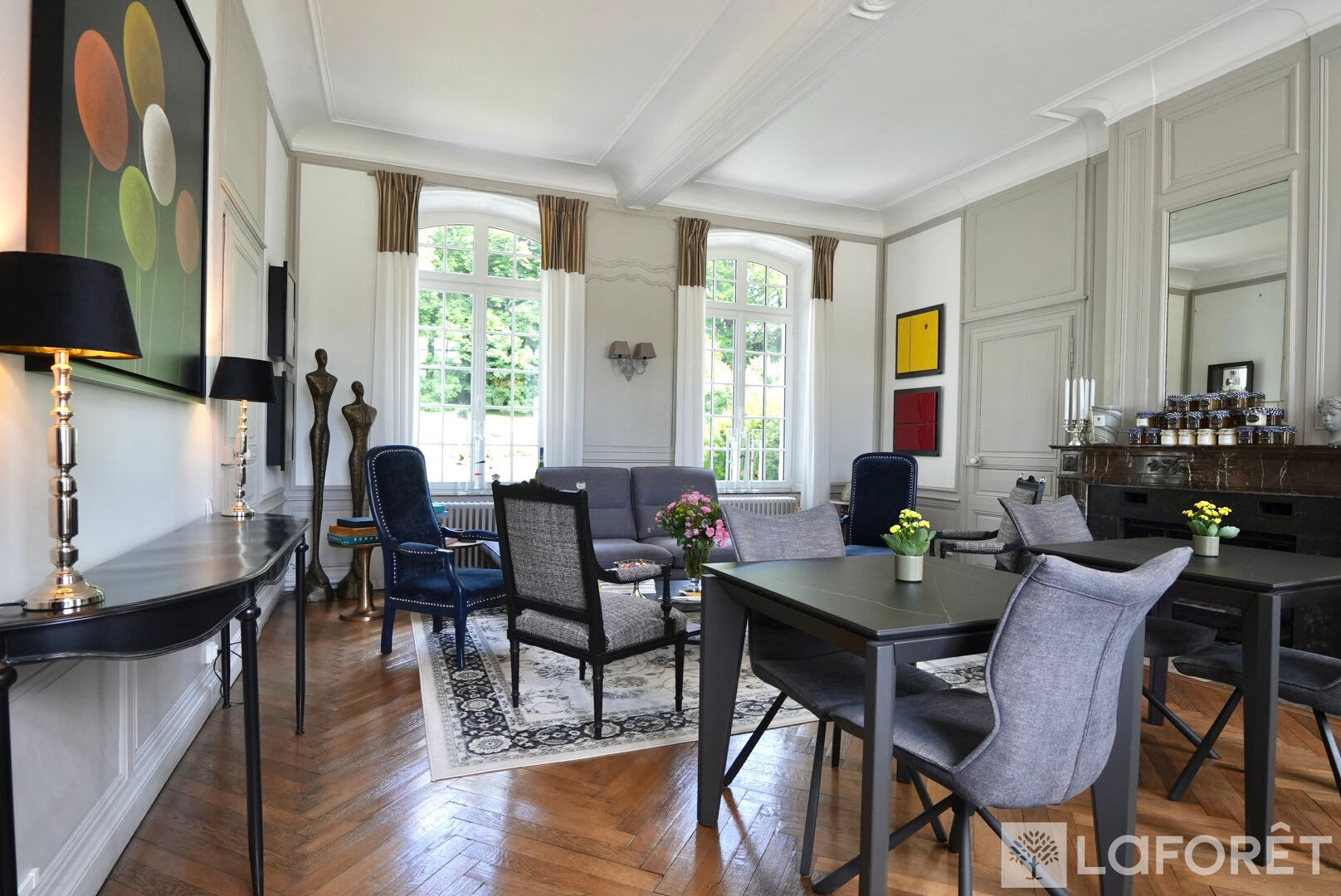 Le vaste salon-séjour, avec sa hauteur sous plafond de plus de 3,50 mètres, est baigné de lumière naturelle et invite à la convivialité, dans un décor noble et raffiné.