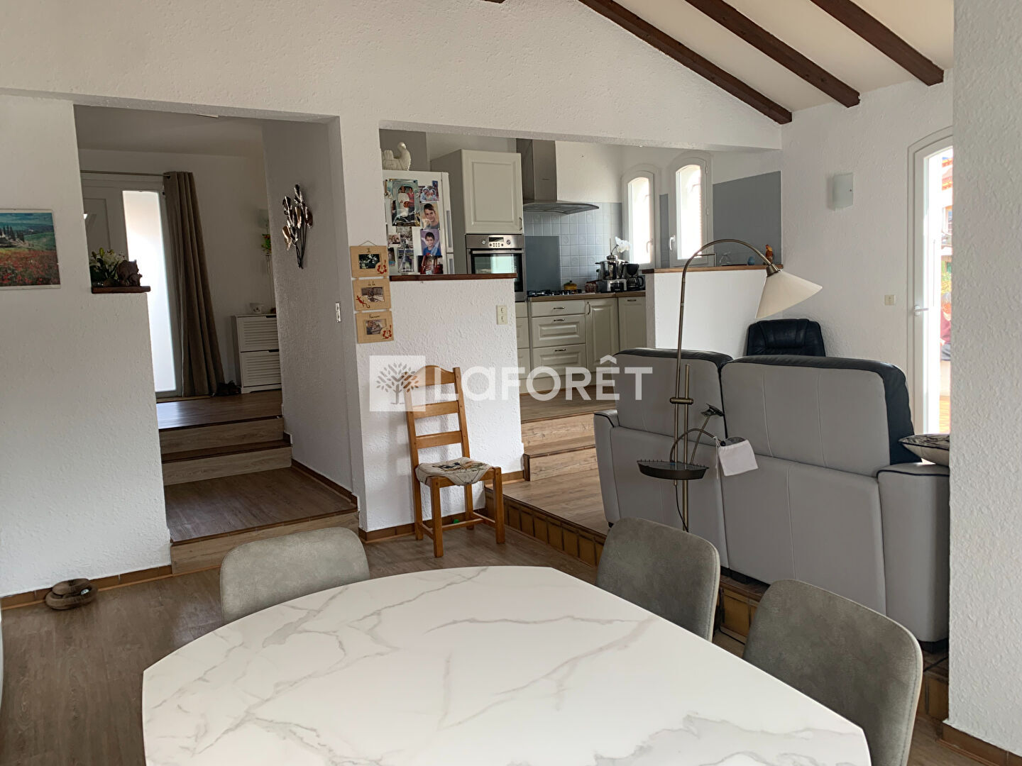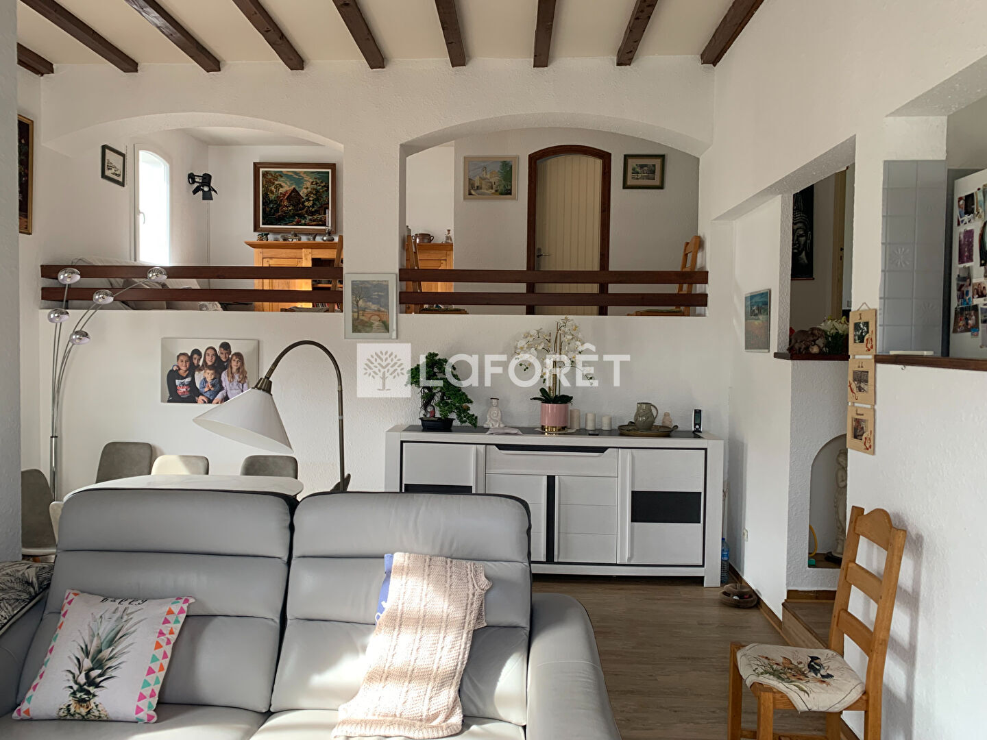 Elle se compose d'une belle entrée, un coin repas, un salon, une cuisine aménagée et équipée, d'une belle mezzanine pouvant servir de bureau où chambre, de deux belles chambres dont une suite parentale avec sa salle d'eau avec son WC, plus un autre WC indépendant. Ce bien est complété d'un très grand garage avec porte motorisé incluant une belle buanderie.