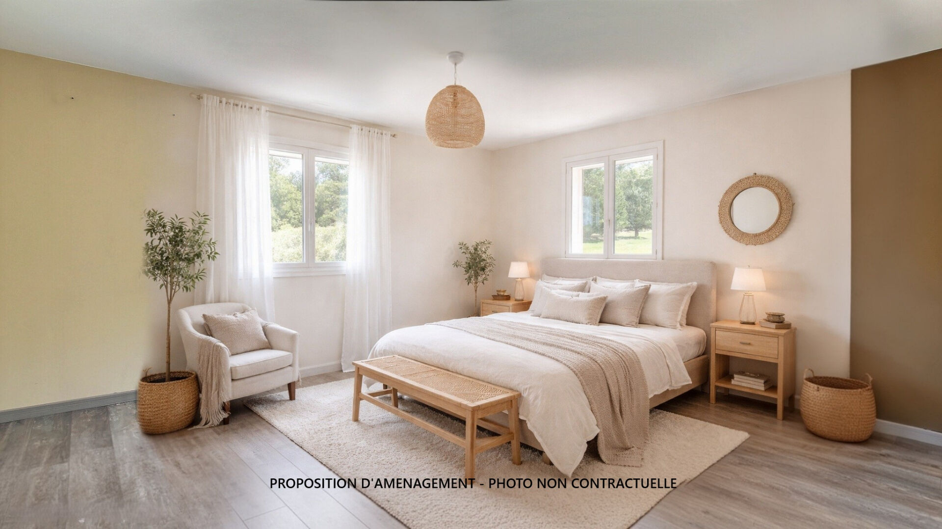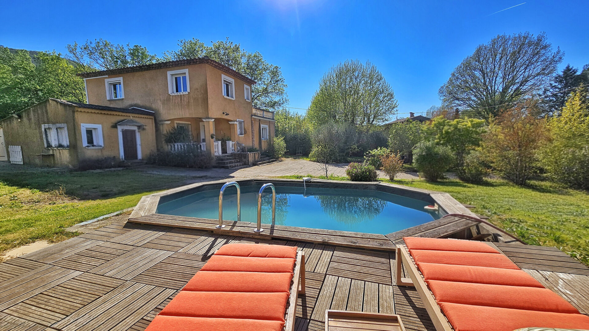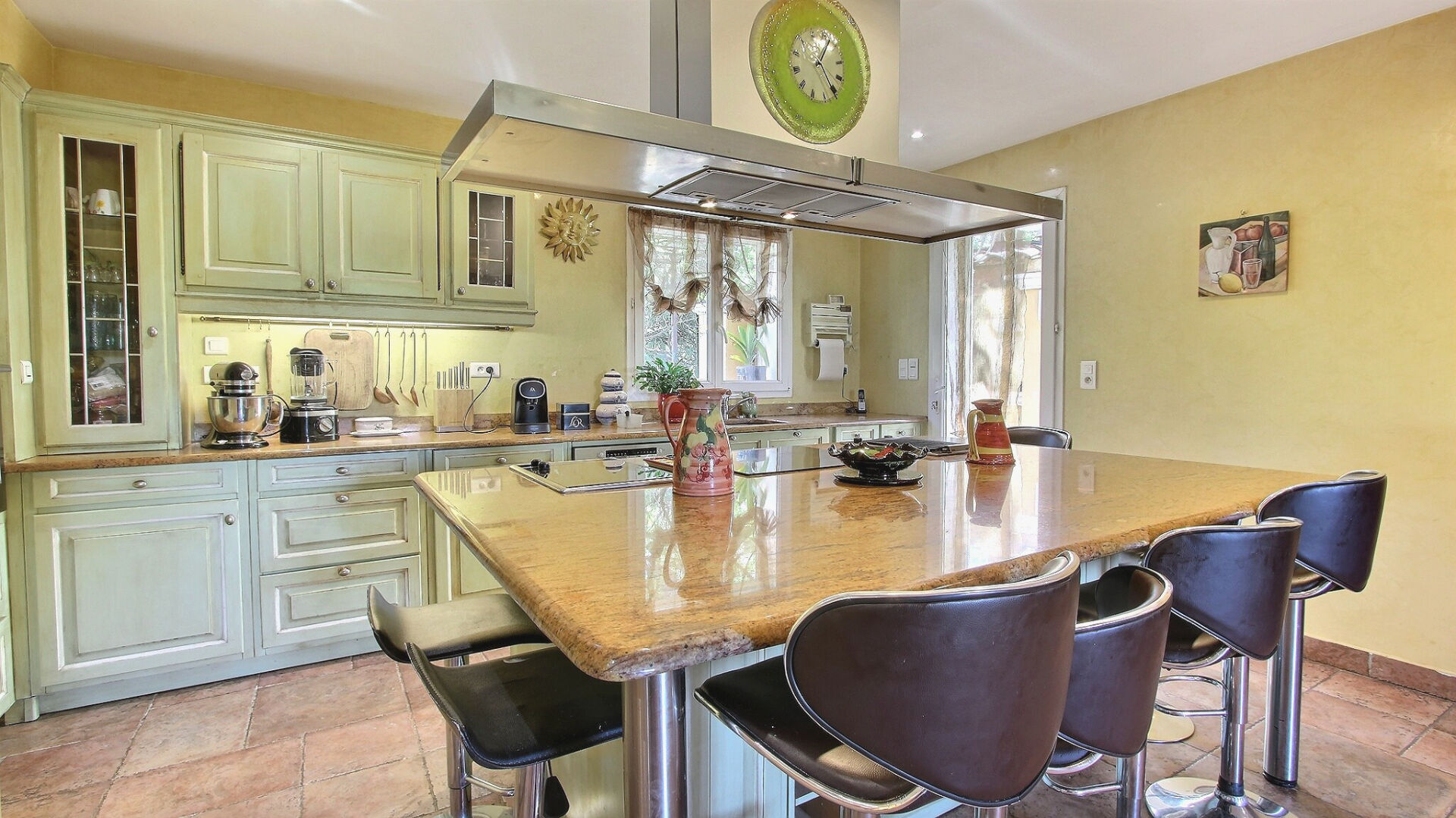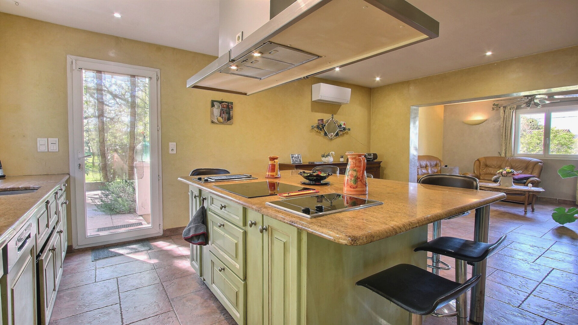 Un intérieur spacieux et lumineux, la maison séduit par son architecture typiquement provençale (toiture à génoise et tuiles feuillets) et ses volumes généreux : Pièce de vie de plus de 60 m², avec insert et climatisation avec sa cuisine ouverte moderne avec îlot central et plan de travail en granit, Bureau en rez-de-chaussée, Salle d'eau avec WC, et Possibilité de créer facilement une chambre de plain-pied
