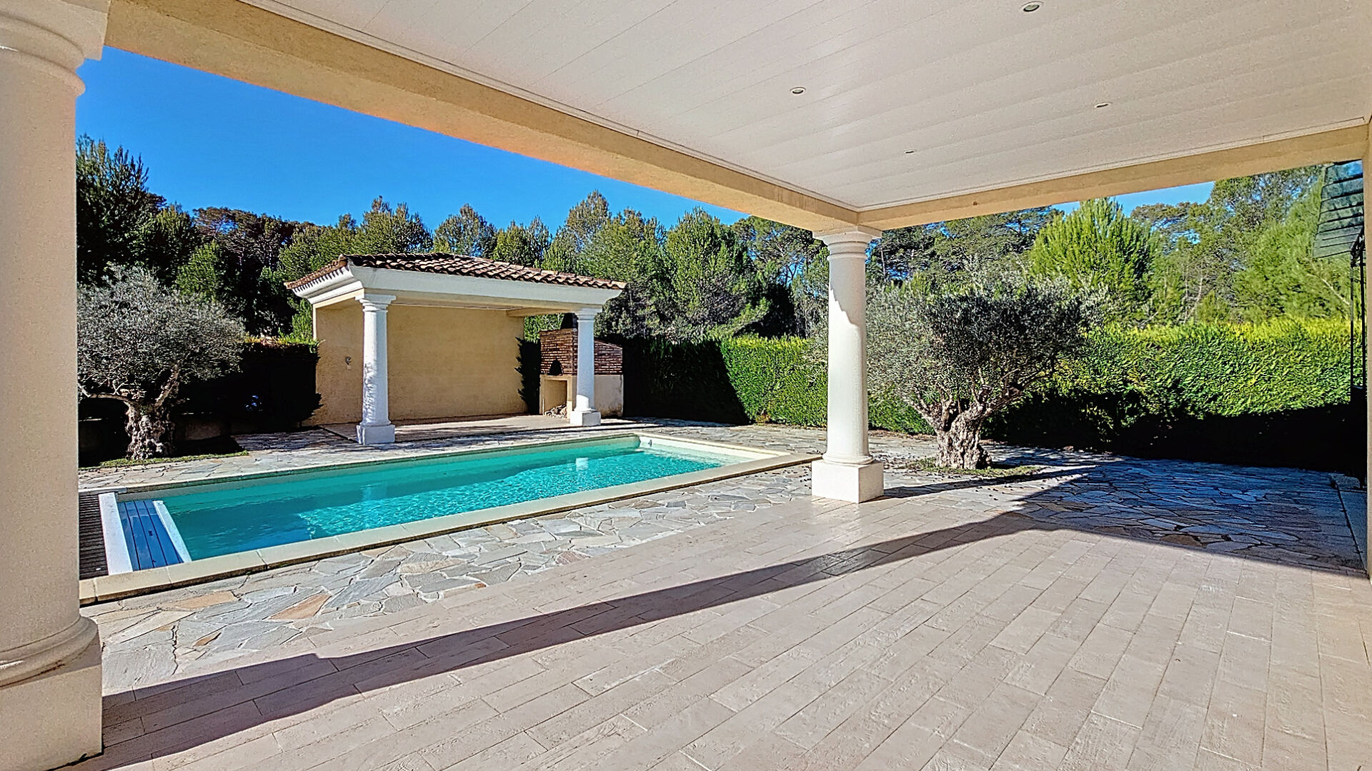 Extérieurs : Terrain clos et arboré de 540 m² avec piscine équipée d'un volet immergé, terrasses couvertes, pool house avec four à pain.