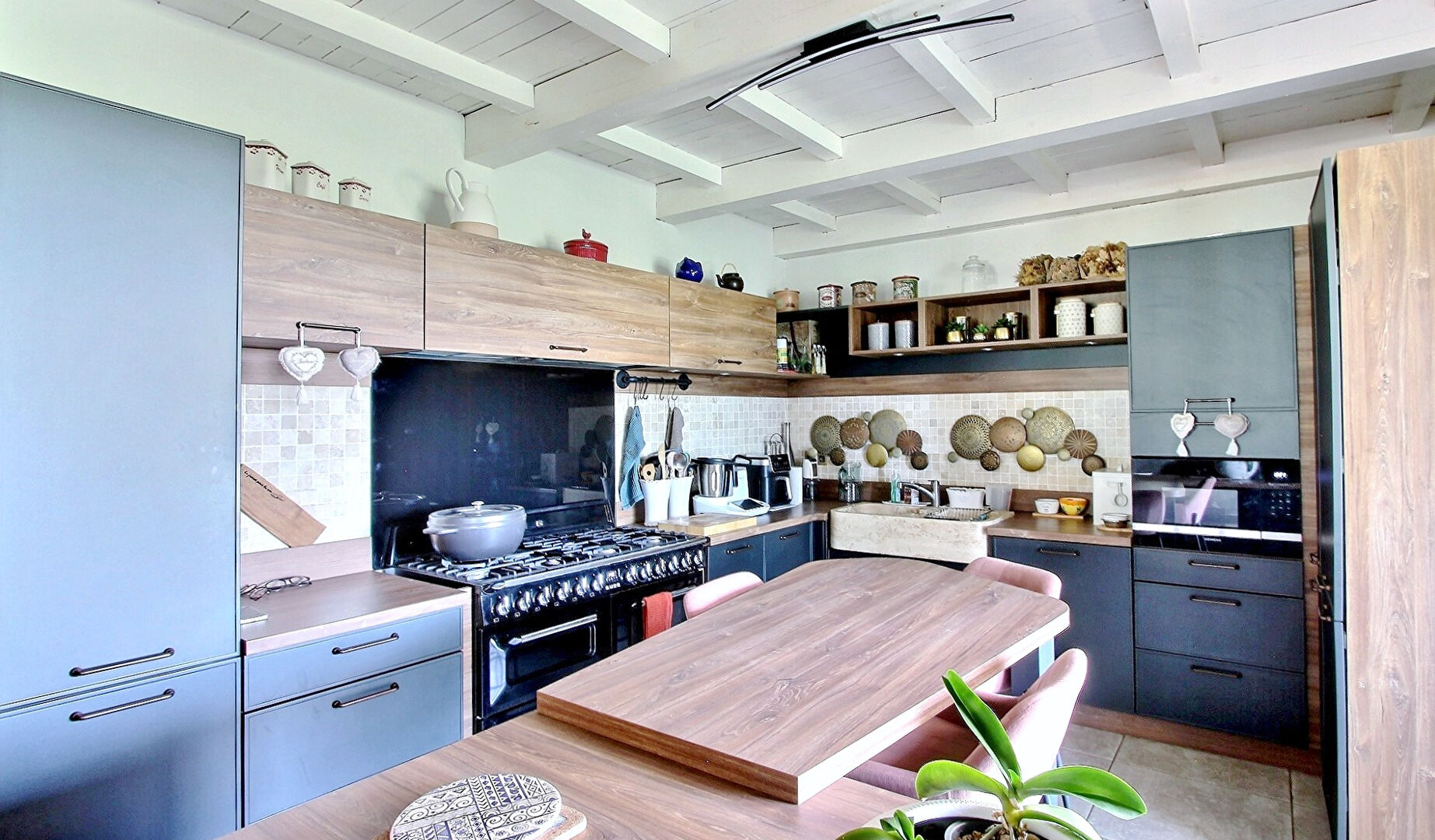 Conçue pour accueillir et partager, la maison séduit par son double séjour chaleureux avec poutres apparentes et poêle à granulés, prolongé par une verrière baignée de lumière. La cuisine moderne et fonctionnelle, les terrasses suspendues, la véranda et les grands espaces extérieurs invitent à des moments conviviaux en famille ou entre amis.