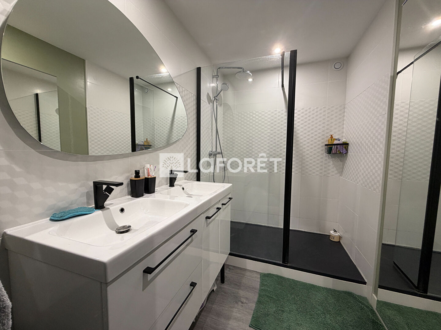 Côté nuit, on retrouve trois chambres confortables, un dressing sur mesure, et une salle d'eau moderne avec grande douche, meuble double vasque et rangement intégré.