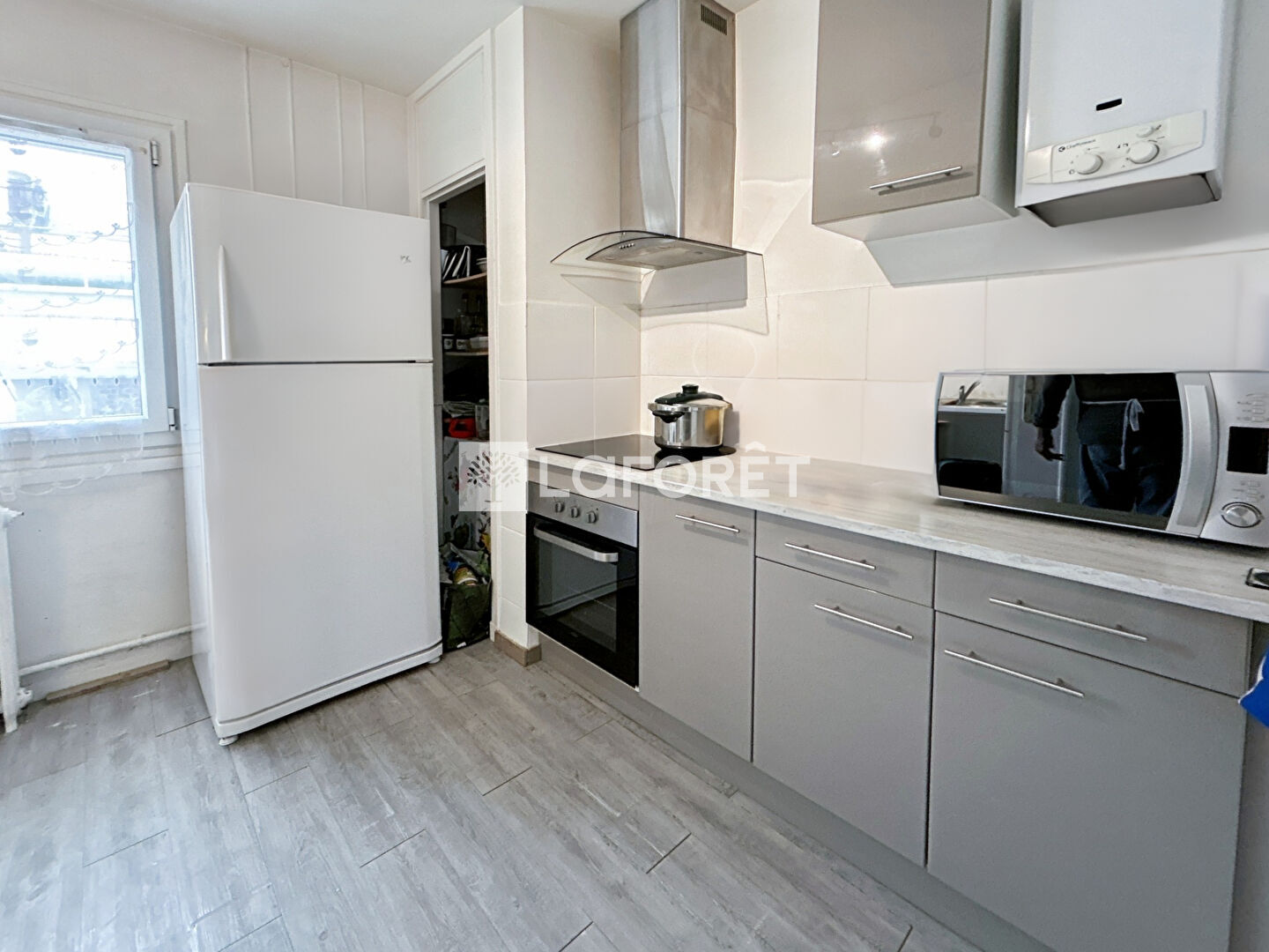 La cuisine indépendante de 9,4 m², équipée et aménagée, vous tend les bras : parquet au sol, fenêtre oscillo-battante, meubles hauts et bas, et même une hotte pour les cuistots inspirés (ou les fans de plats à emporter bien déguisés).