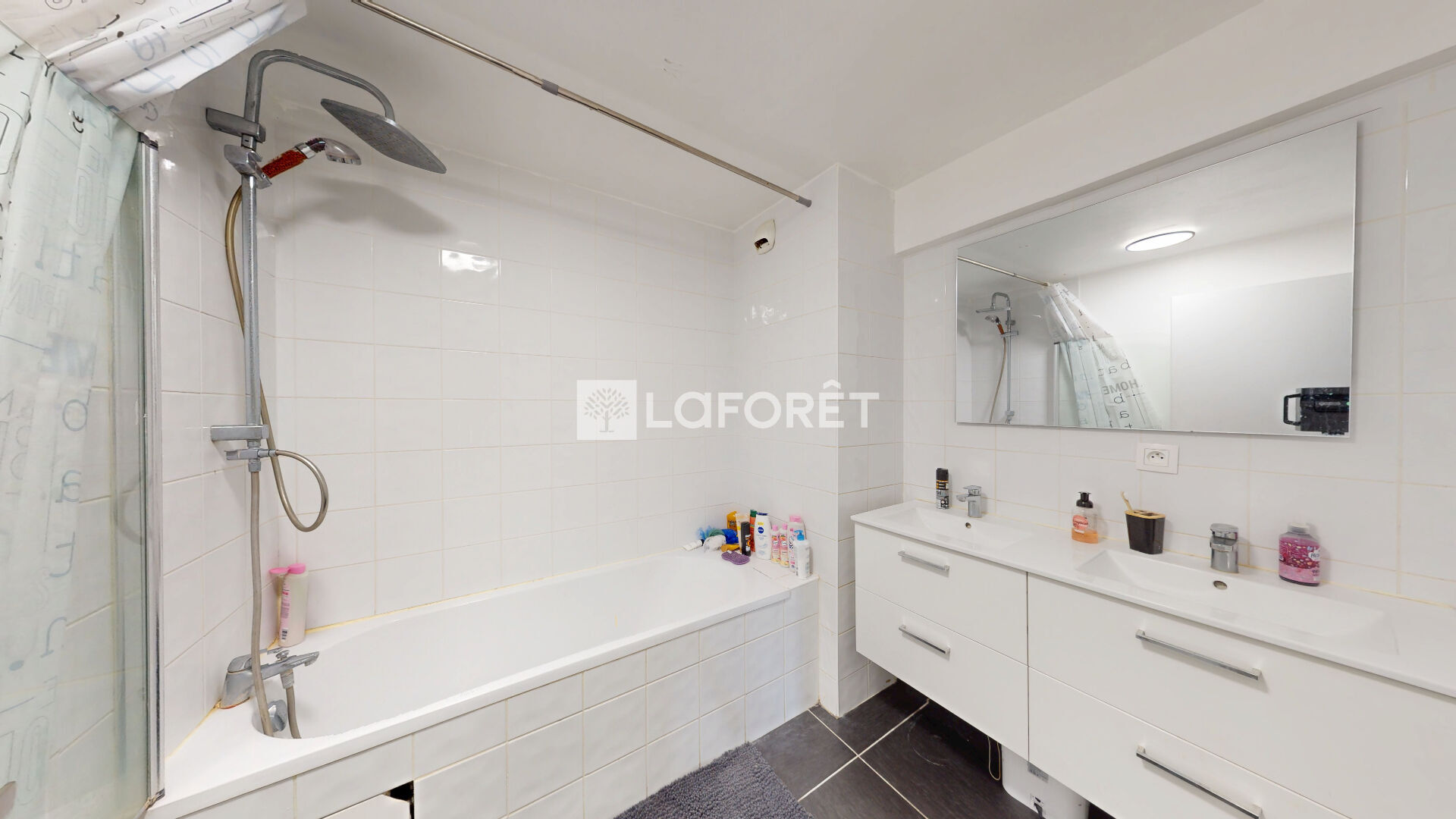 - Salle de bains élégante avec baignoire, carrelage impeccable, meuble double vasque avec rangements et meuble suspendu.