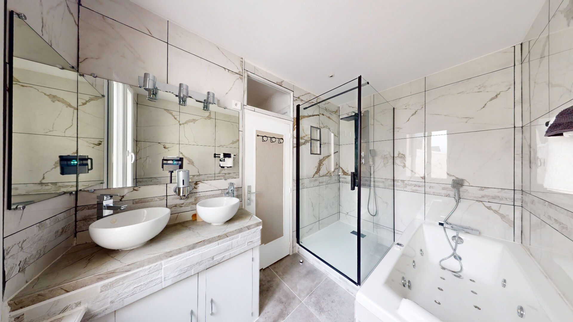 À l'étage, l'espace nuit propose deux chambres confortables avec rangements ainsi qu'une salle de bains avec douche et WC.