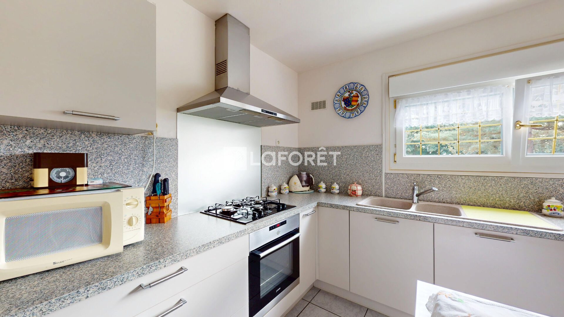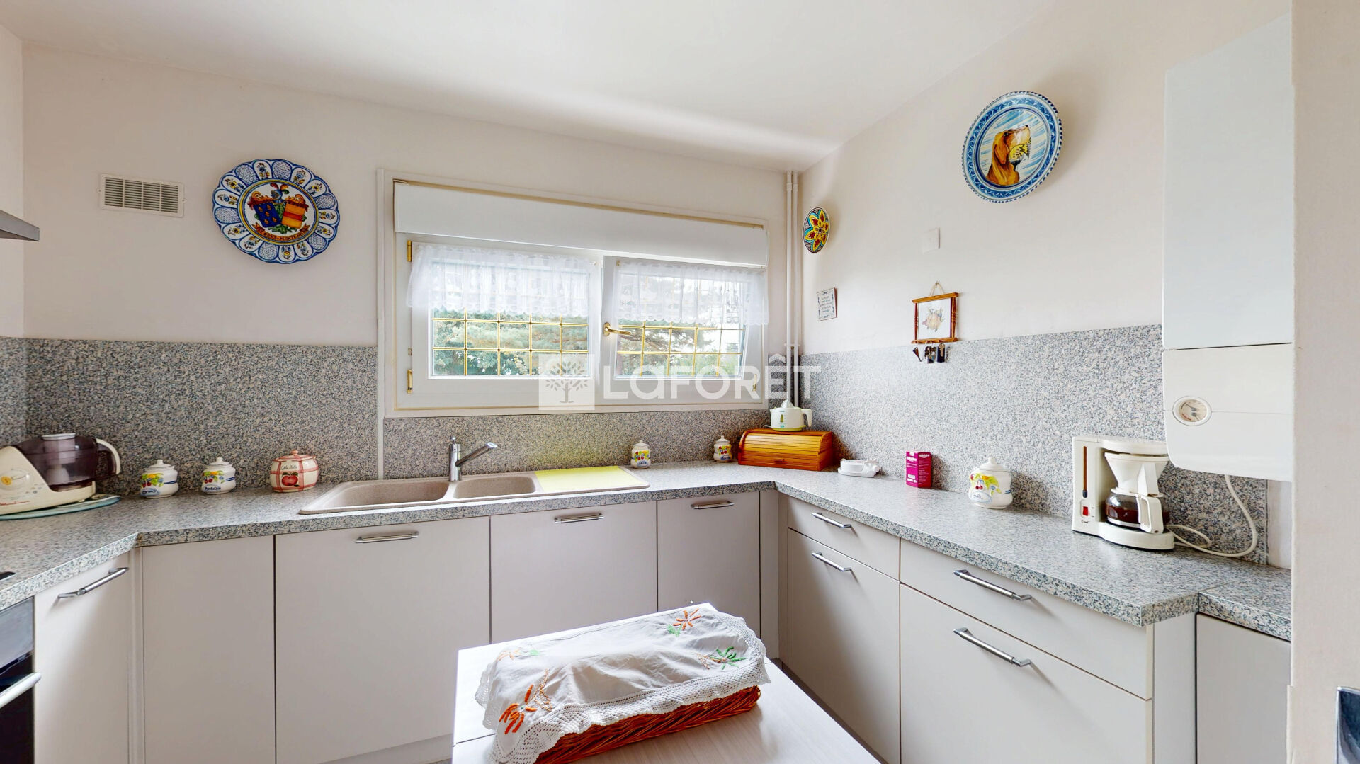 - Une cuisine séparée, aménagée et équipée, avec double vasque, meubles hauts et bas élégants, rangements généreux, grands plans de travail, fenêtre à croisillons et sol carrelé.