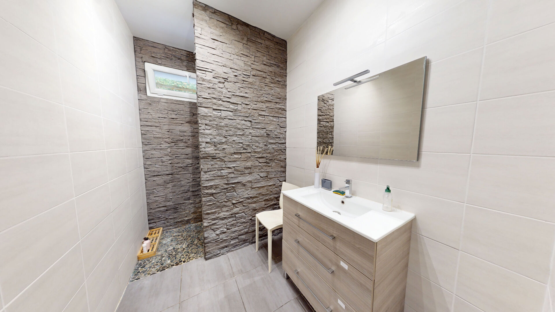 Toujours au rez-de-chaussée : une chambre, une salle d'eau moderne avec douche à l'italienne, des WC séparés et une véranda baignée de lumière, parfaite pour les matinées tranquilles ou les soirées d'été.