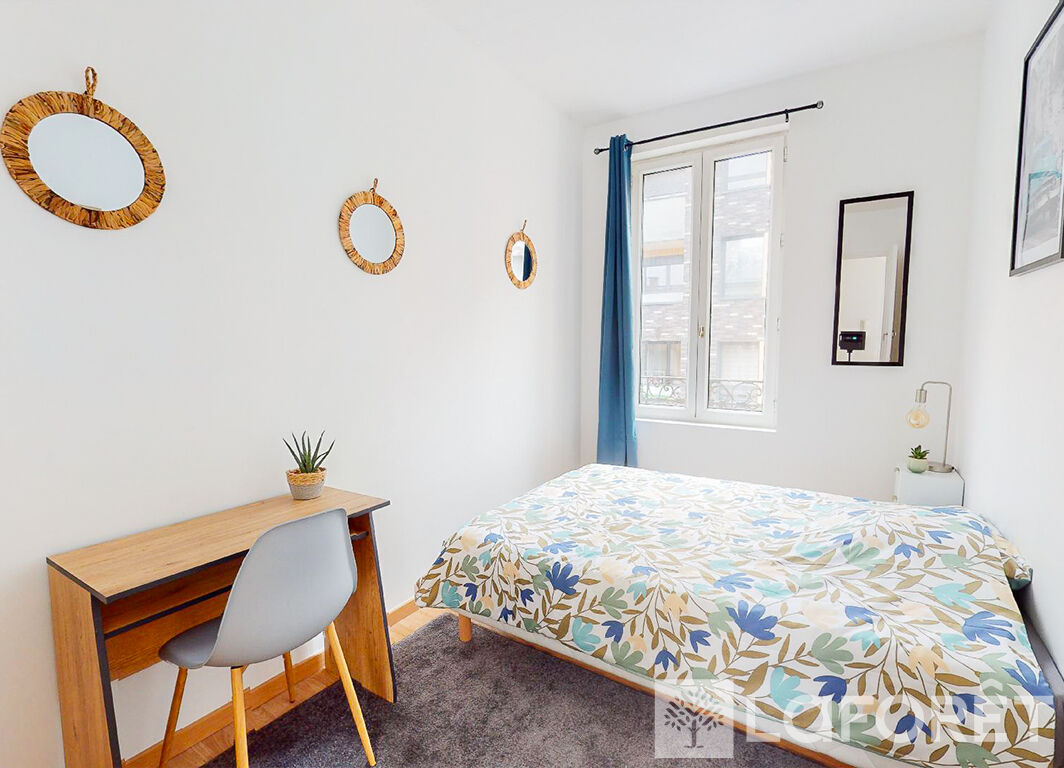 2 vraies chambres, toutes deux meublées avec soin : lit, bureau, chaise, table de nuit, commode, TV, décoration sobre et efficace (miroirs, cadres, luminaires), portes moulurées qui se ferment à clé (parce que l'intimité, c'est sacré, surtout en coloc).