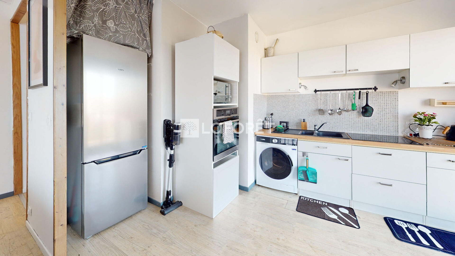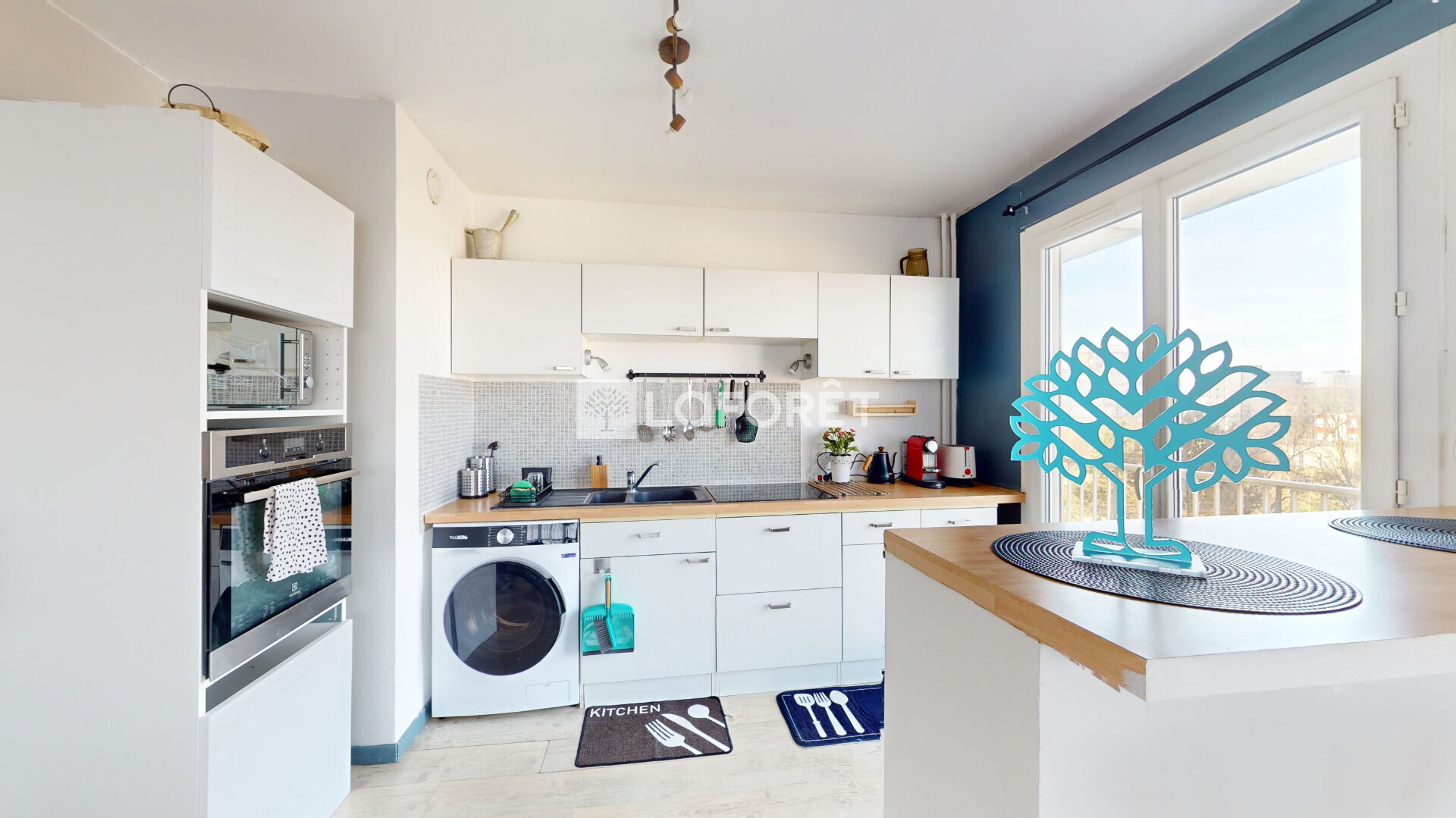 plan de travail généreux, nombreux rangements, comptoir pour vos repas du quotidien, four, machine à laver, et un accès direct au balcon pour vos cafés en extérieur.