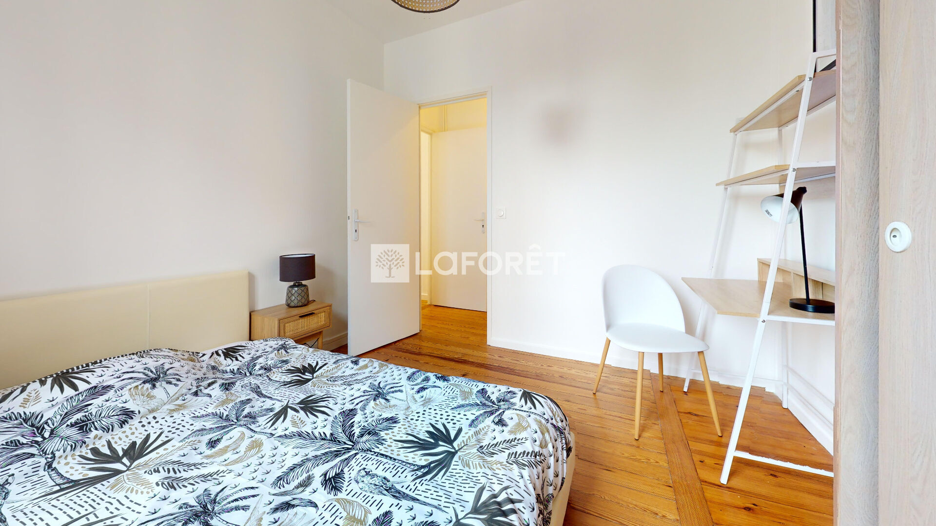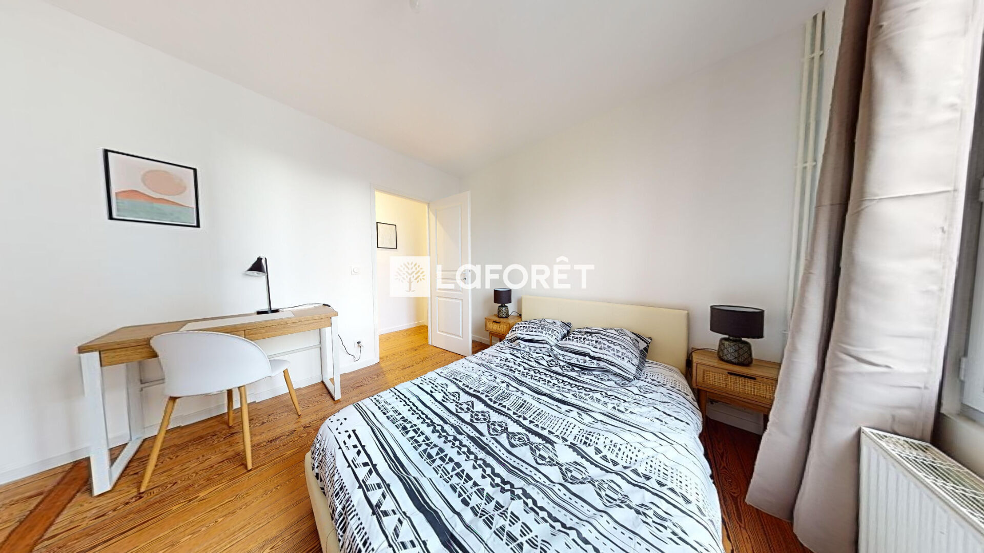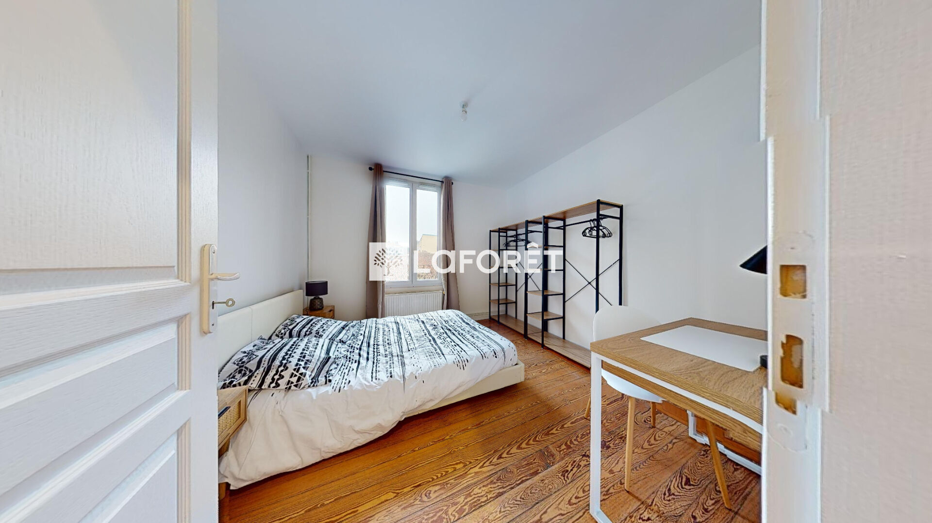 Côté nuit, deux chambres spacieuses et claires sont aménagées avec lits doubles, dressings ou penderies, bureaux et chaises, idéales pour des colocataires ou un couple avec un espace de télétravail.