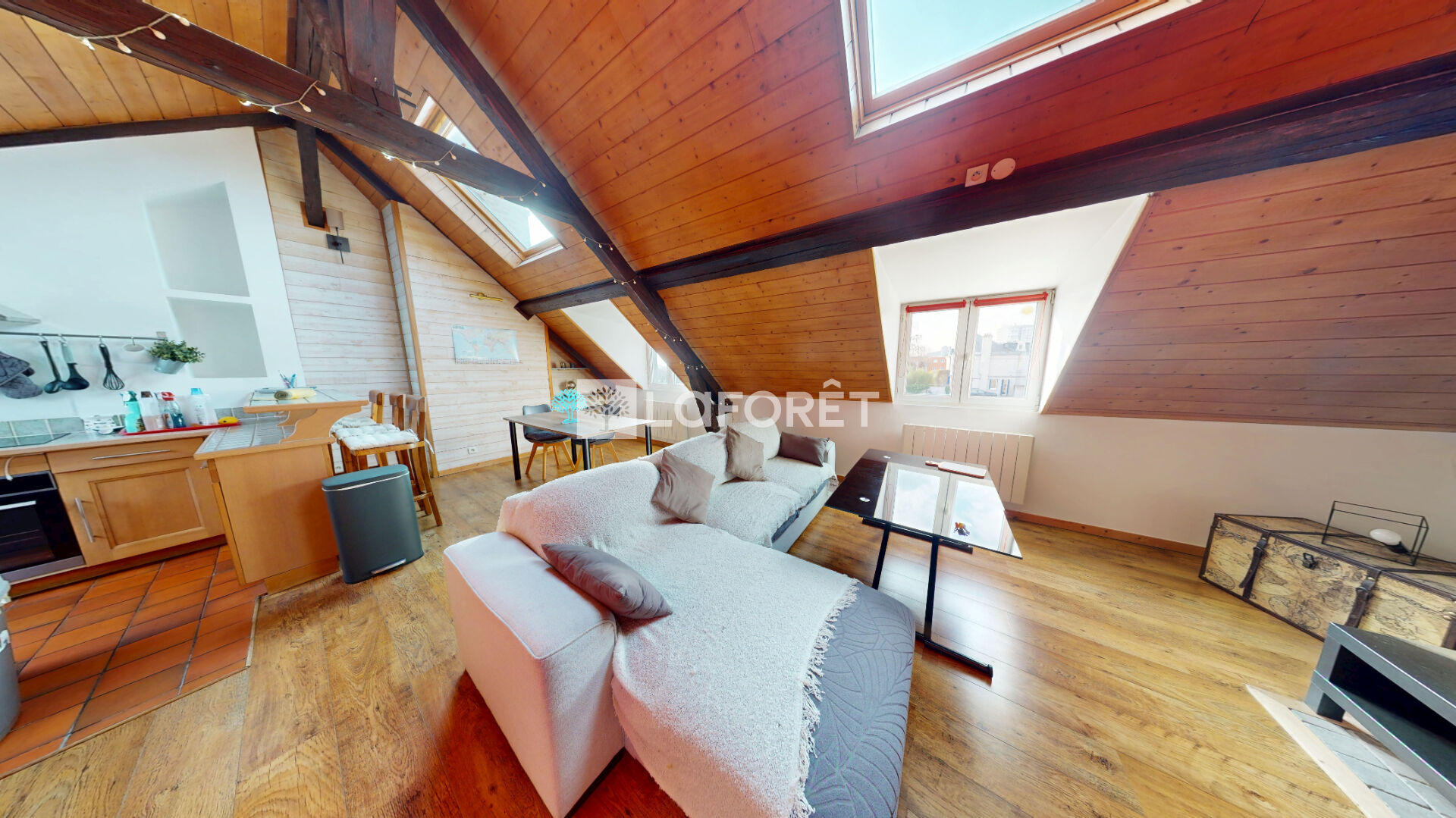 - Séjour de 36 m² Carrez, parquet, poutres apparentes, velux, offrant une ambiance chaleureuse et lumineuse, idéal pour les moments entre colocataires.