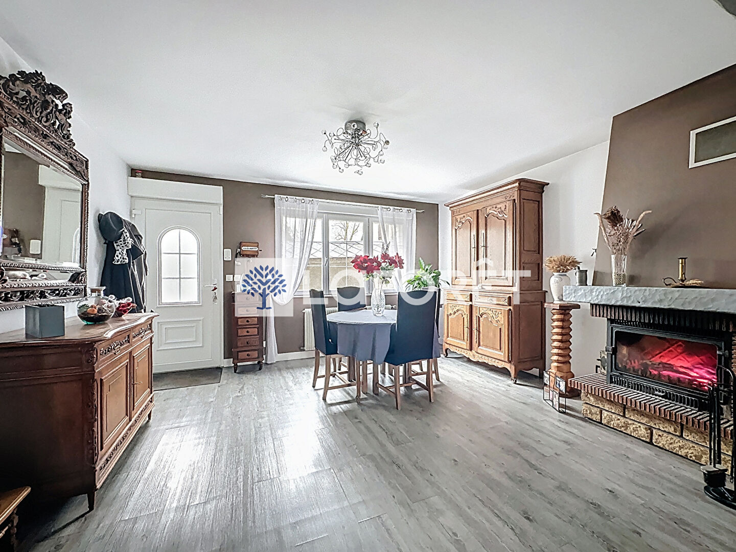 Elle se compose, au rez-de-chaussée, d'un salon/séjour avec insert, d'une cuisine aménagée, d'une salle d'eau, d'un dressing ainsi que d'un garage.