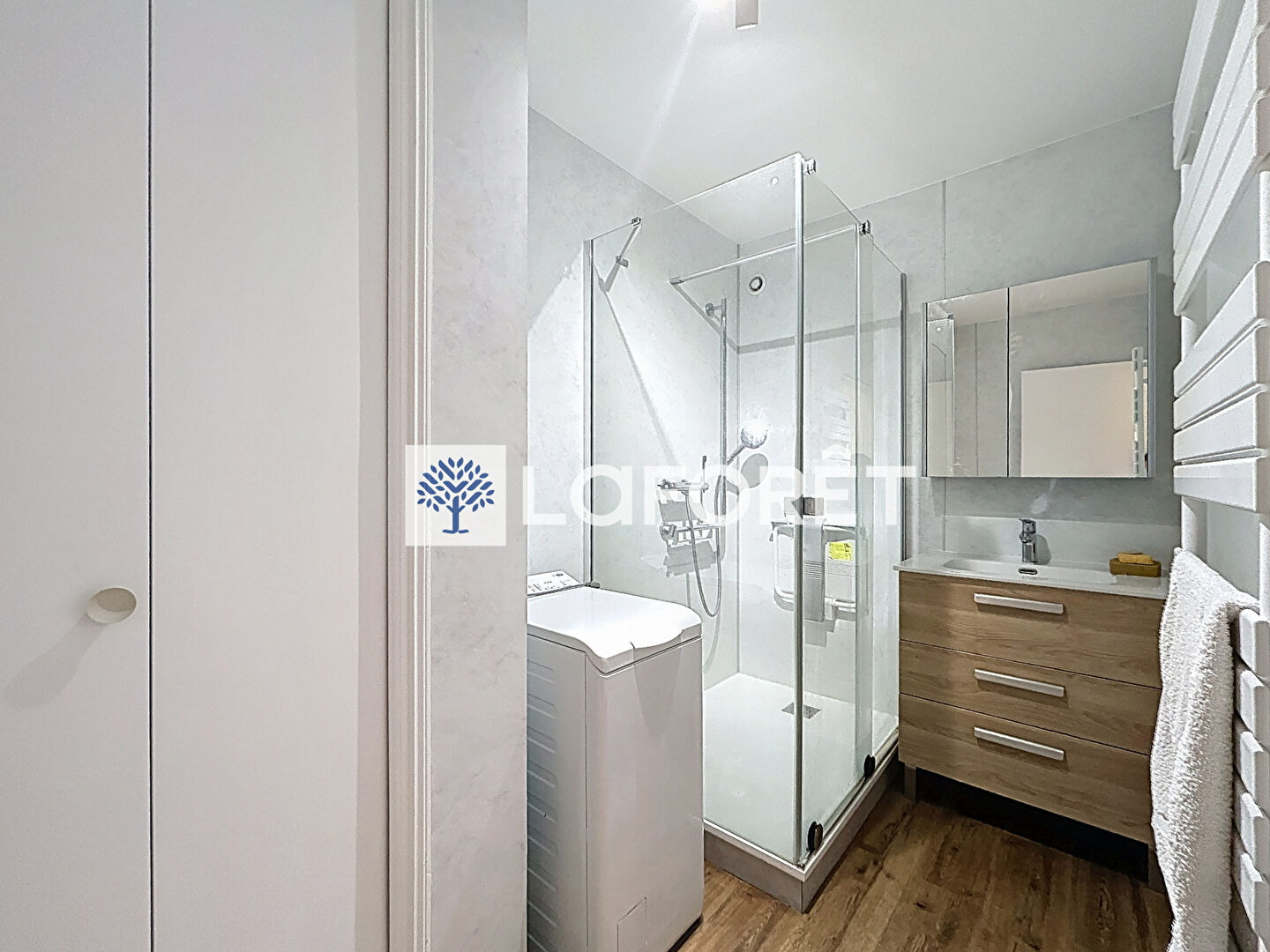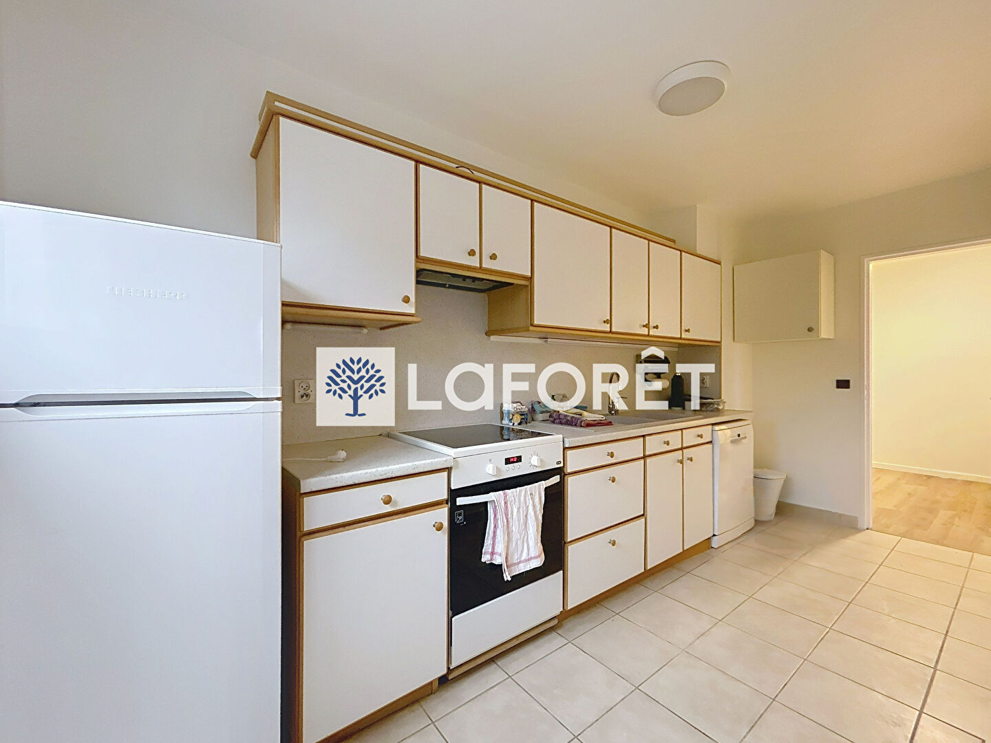 Une cuisine aménagée et équipée (cuisinière, hotte, réfrigérateur et lave-vaisselle) séparée du séjour, une salle de douche avec machine à laver, une chambre et un WC individuel.