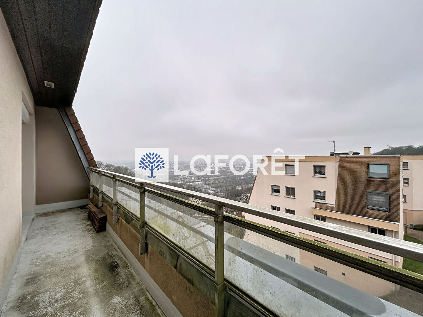 Ce dernier est composé d'une entrée avec nombreux rangement venant desservir un séjour ainsi qu'un bureau/une chambre donnant sur un balcon avec une magnifique vue sur la ville de Rouen.
