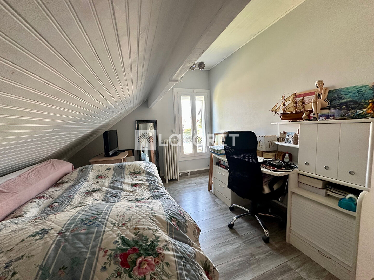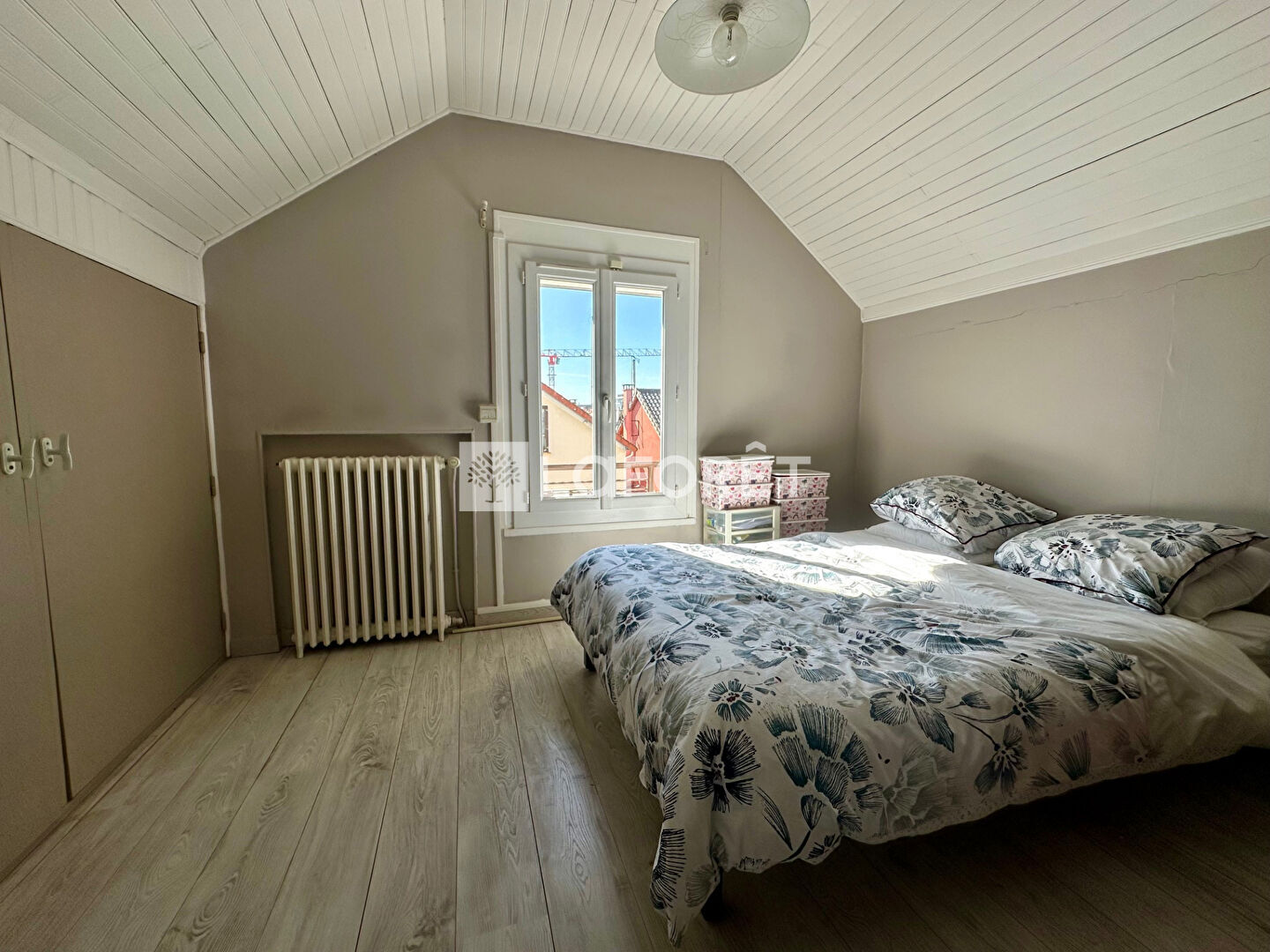L'étage est composé d'une belle chambre avec des rangements . Un coin nuit sous pente (12m2 au sol), une salle de bains avec wc.