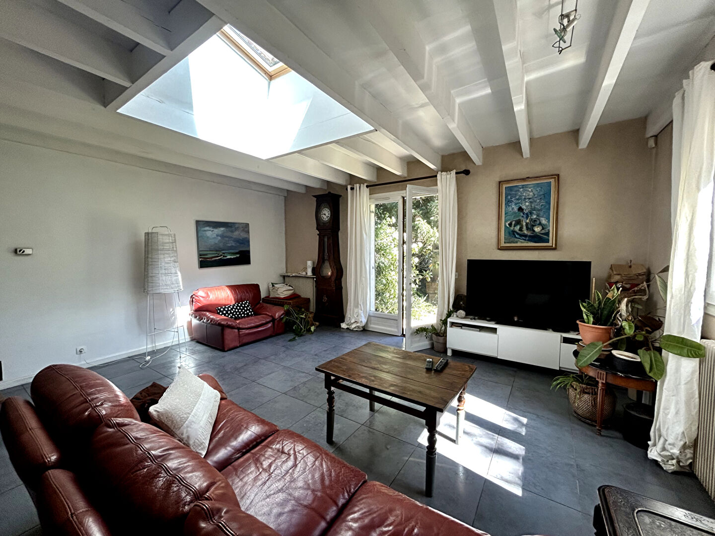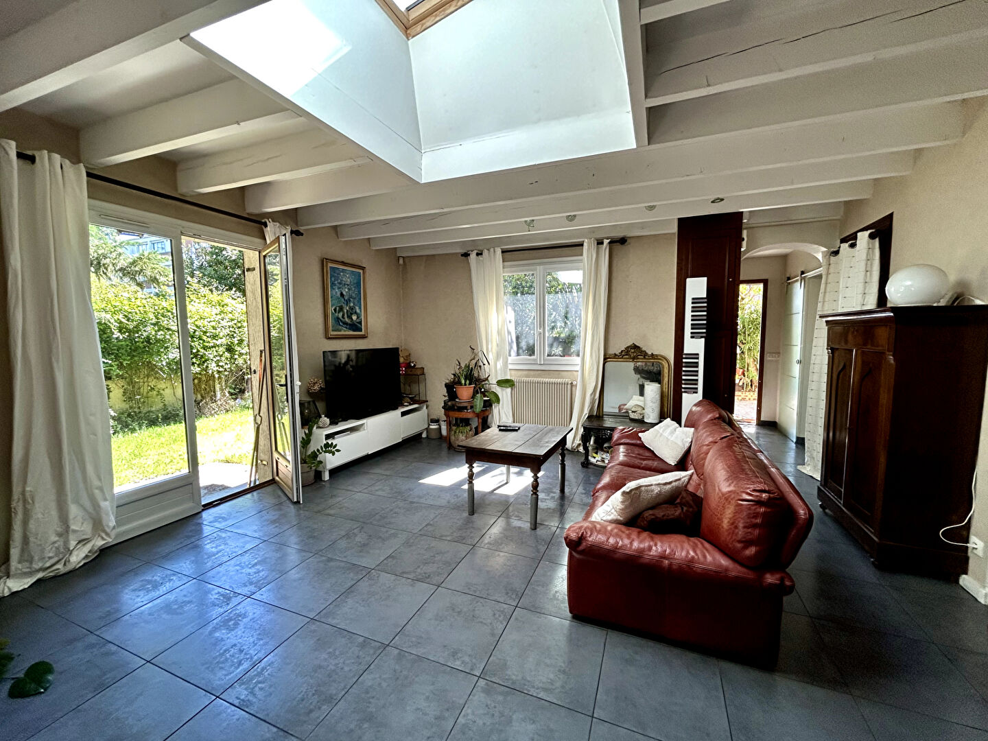 Elle se compose d'un bel espace de vie de 47 m² comprenant une cuisine ouverte, une salle à manger et un séjour, avec accès direct au jardin et à la terrasse exposés sud-est, offrant une belle luminosité.