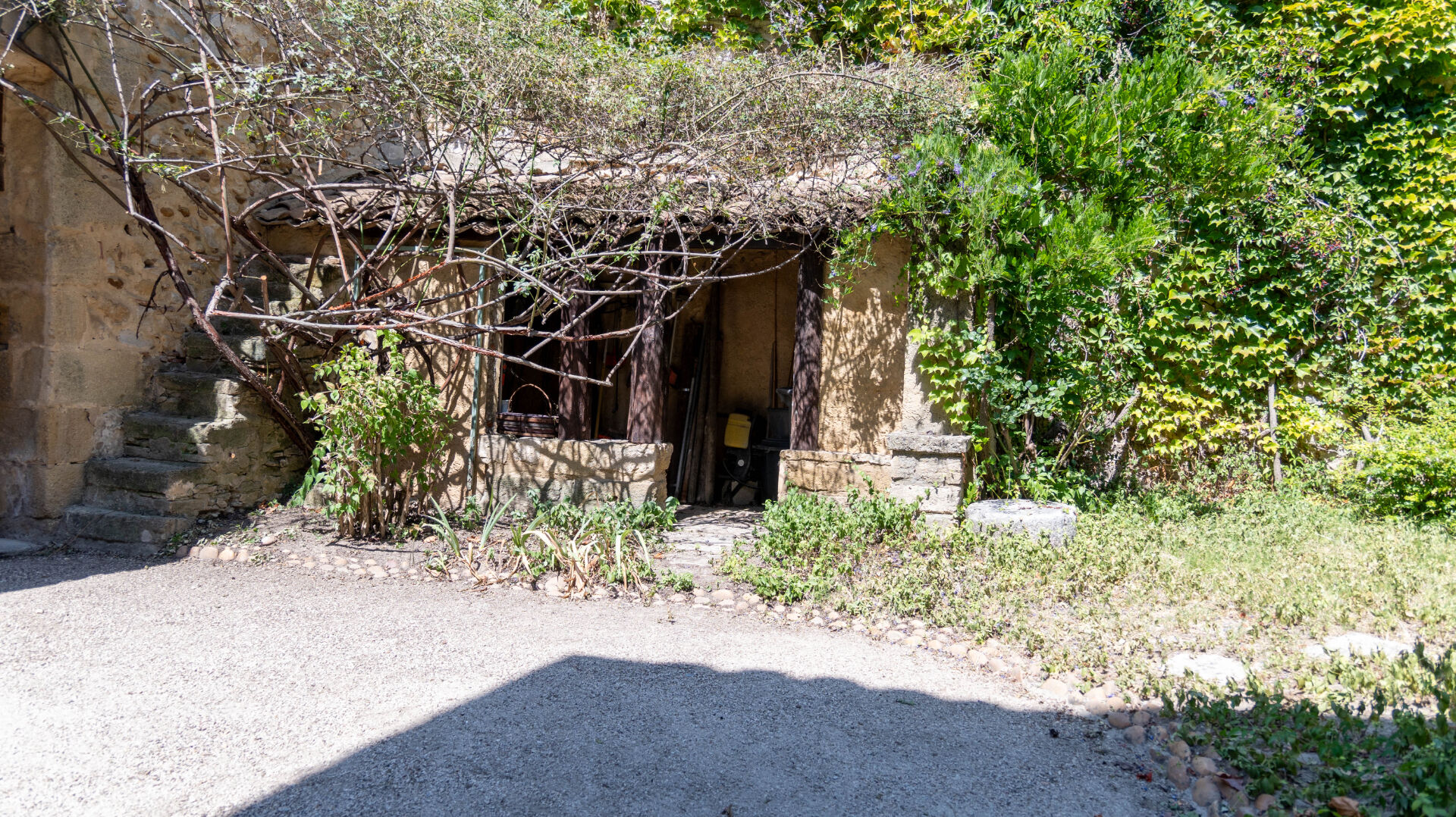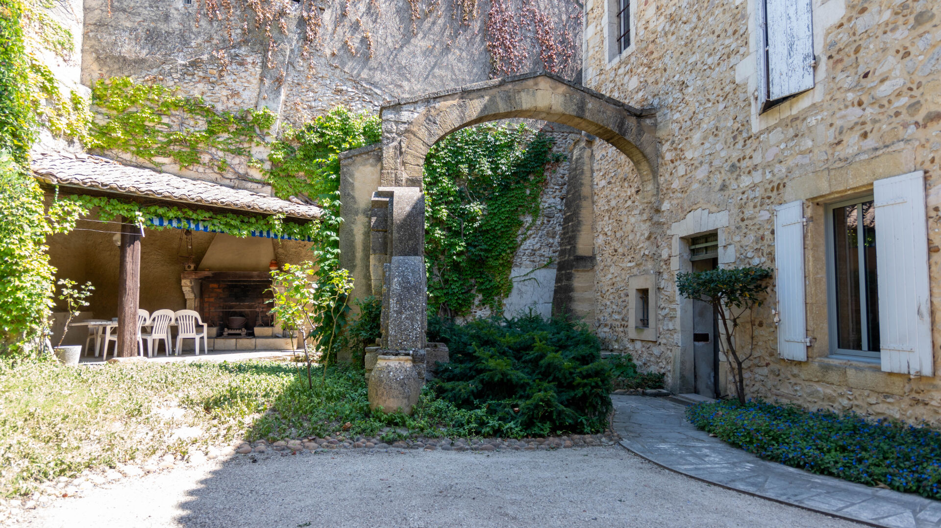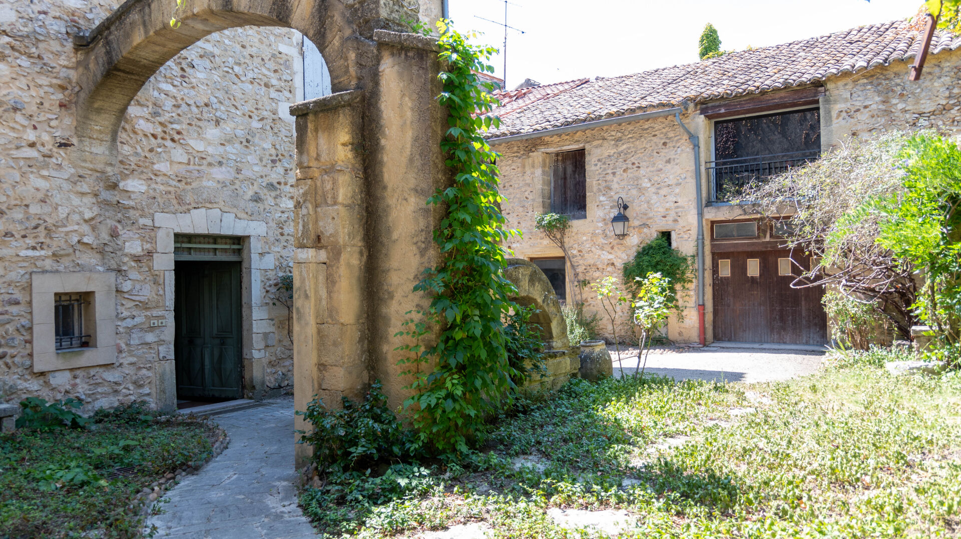 Le bâtiment s'articule autour d'une cour intérieure avec un jardin intimiste qui offre la possibilité de stationner 2 ou 3 véhicules. Les extérieurs disposent d'un puit pour l'arrosage, d'une cuisine d'été, d'un atelier de 30m²,d' un garage sur 2 niveaux d'environ 26m² et d' un pigeonnier.