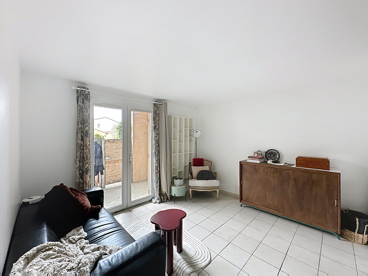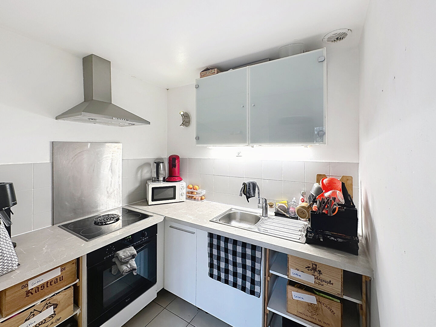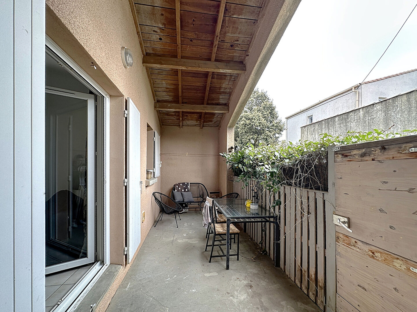 Pièce de vie avec cuisine aménagée ouverte, terrasse abritée plein sud, une chambre avec placard et salle d'eau avec wc, cellier.