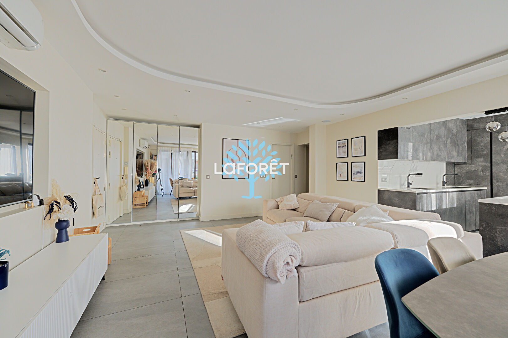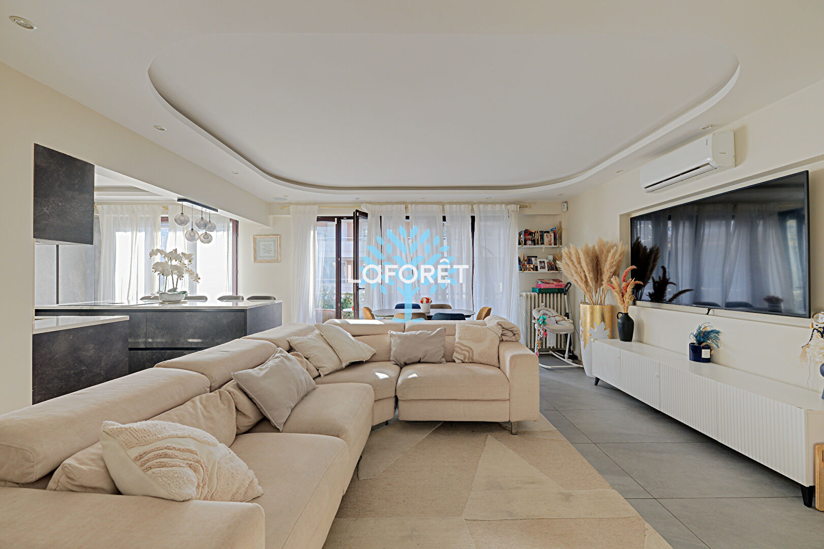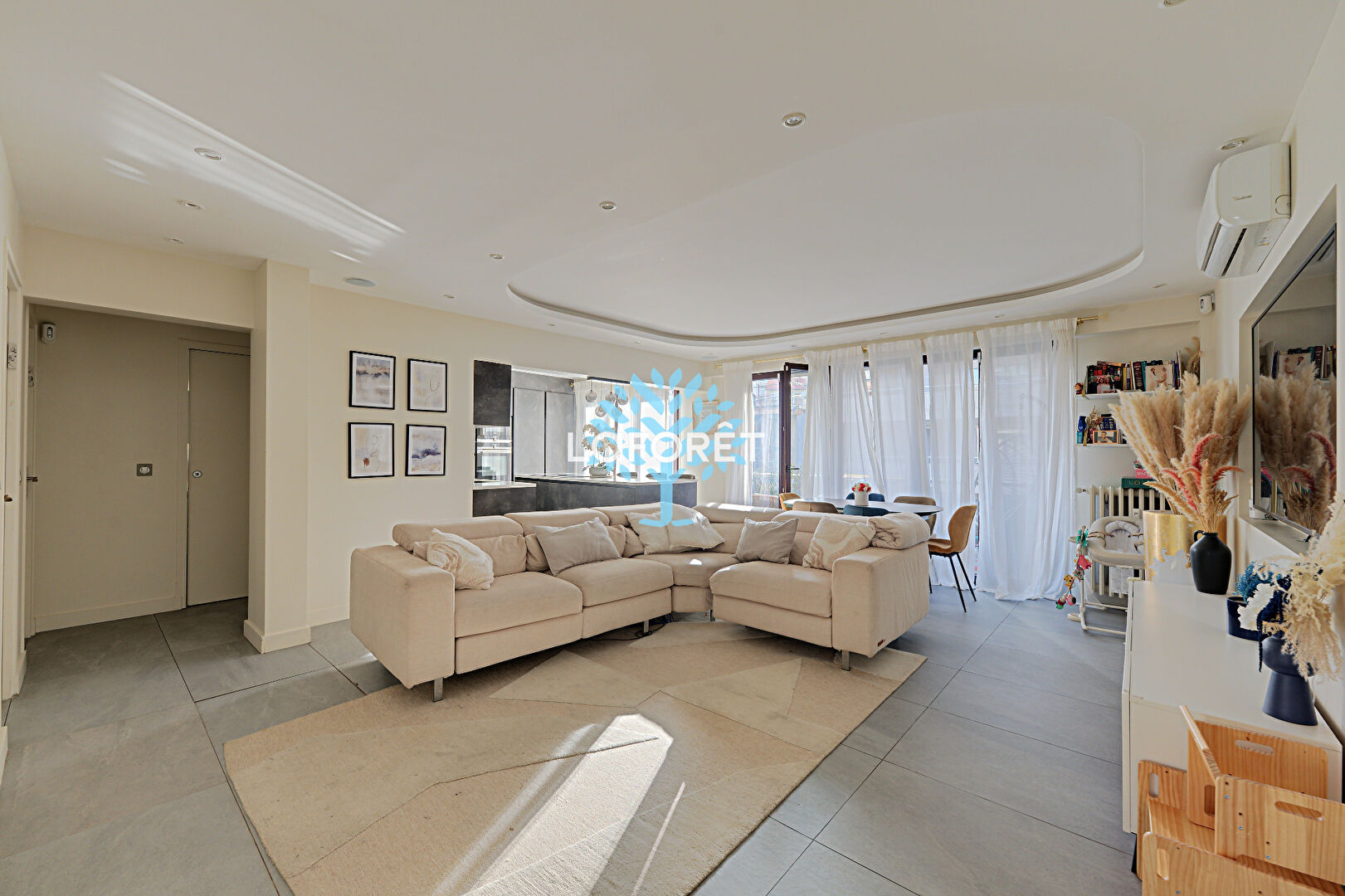 Il se compose d'une entrée desservant un vaste double séjour d'environ 40 m² avec une cuisine ouverte sur-mesure, doublement équipée (deux éviers, deux plans de travail, nombreux rangements), le tout donnant accès à un premier balcon.