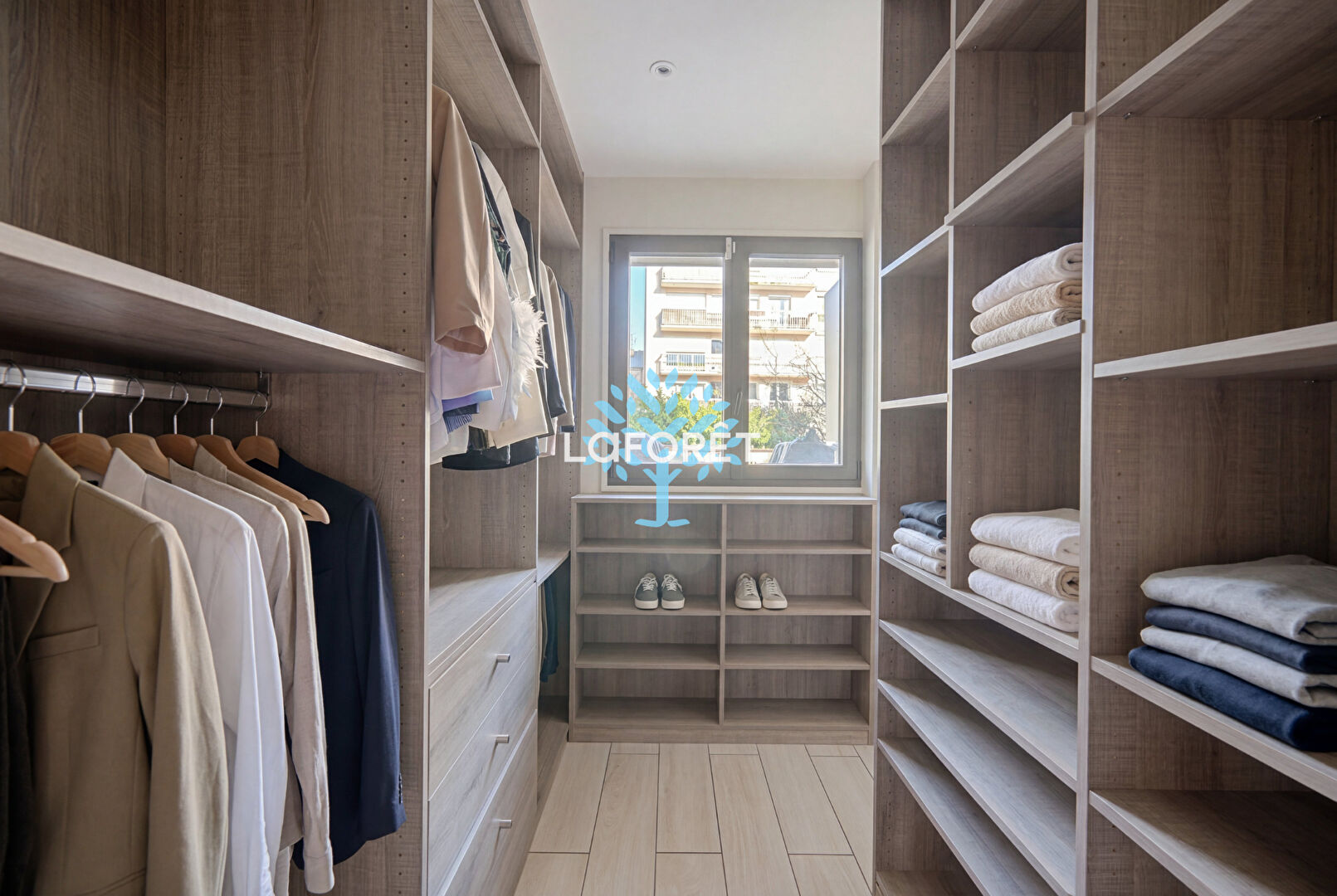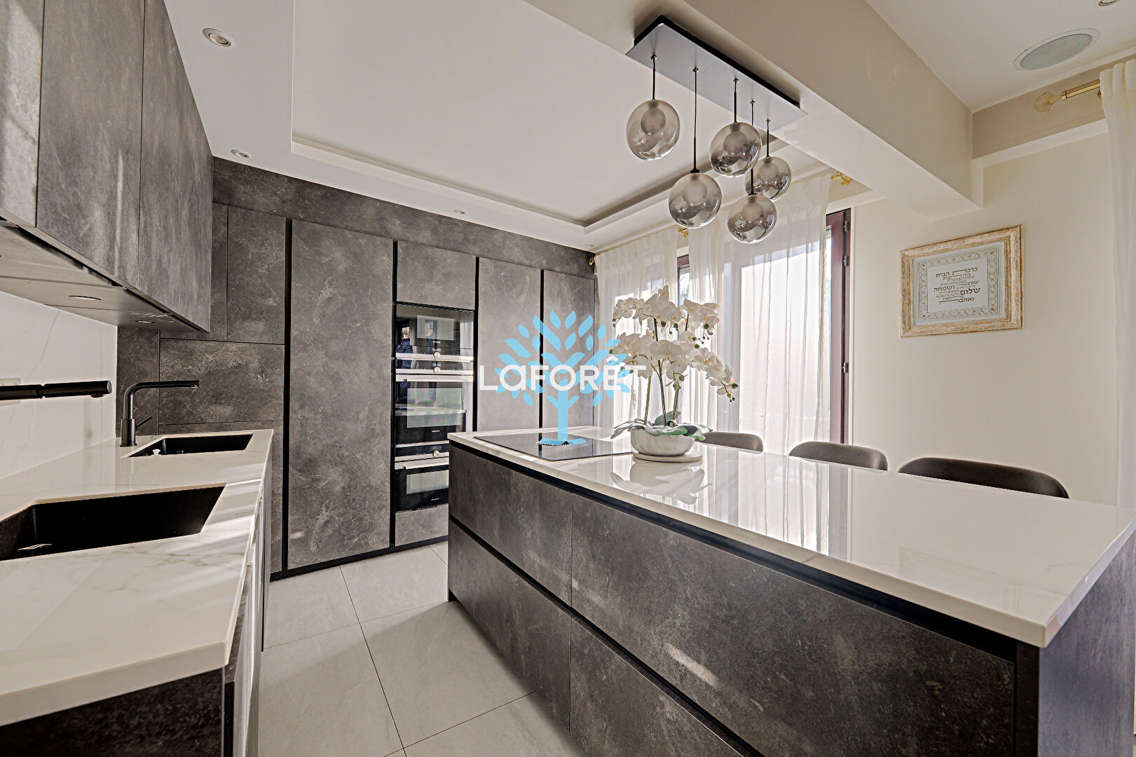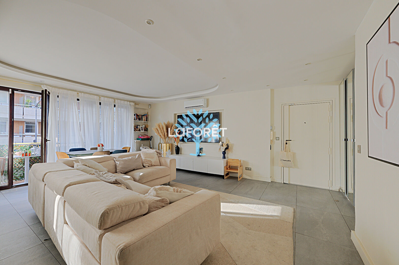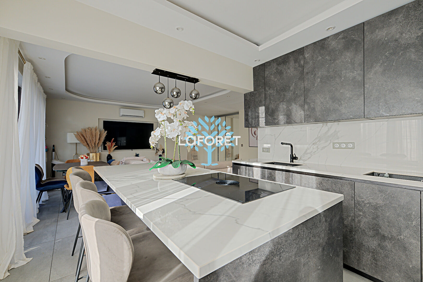 Il se compose d'une entrée desservant un vaste double séjour d'environ 40 m² avec une cuisine ouverte sur-mesure, doublement équipée (deux éviers, deux plans de travail, nombreux rangements), le tout donnant accès à un premier balcon.
