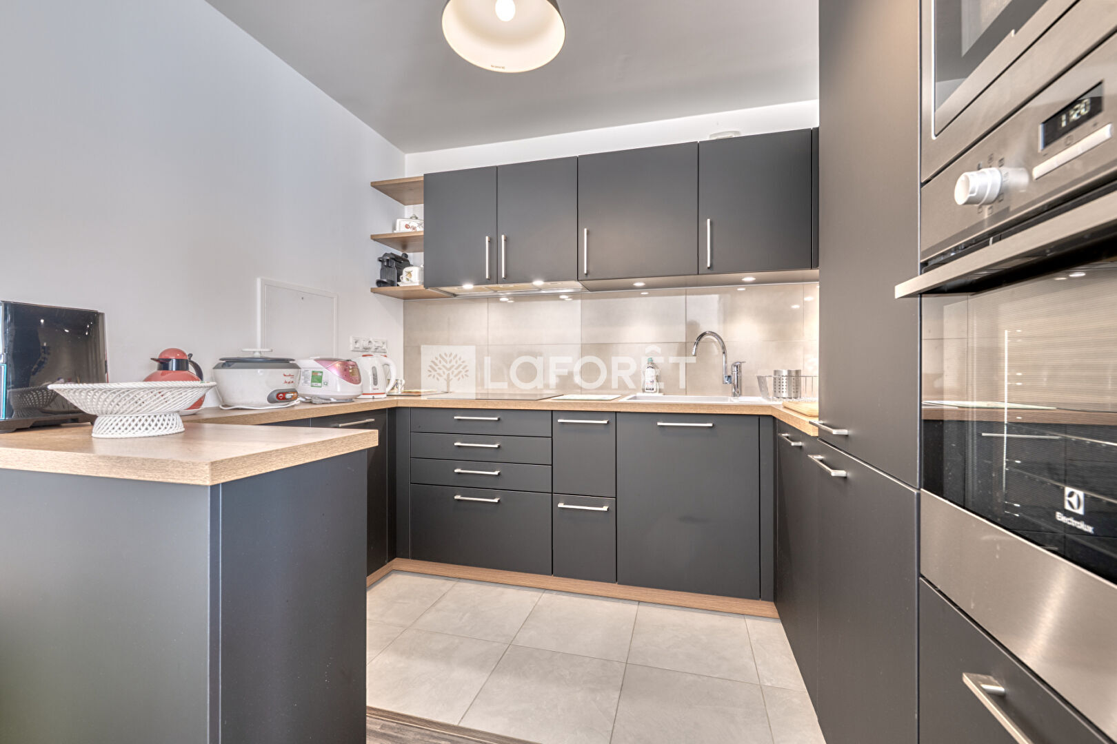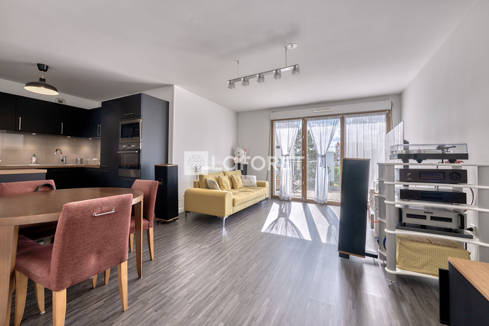 Entrée via une loggia, cuisine ouverte sur le salon, donnant accès au balcon.