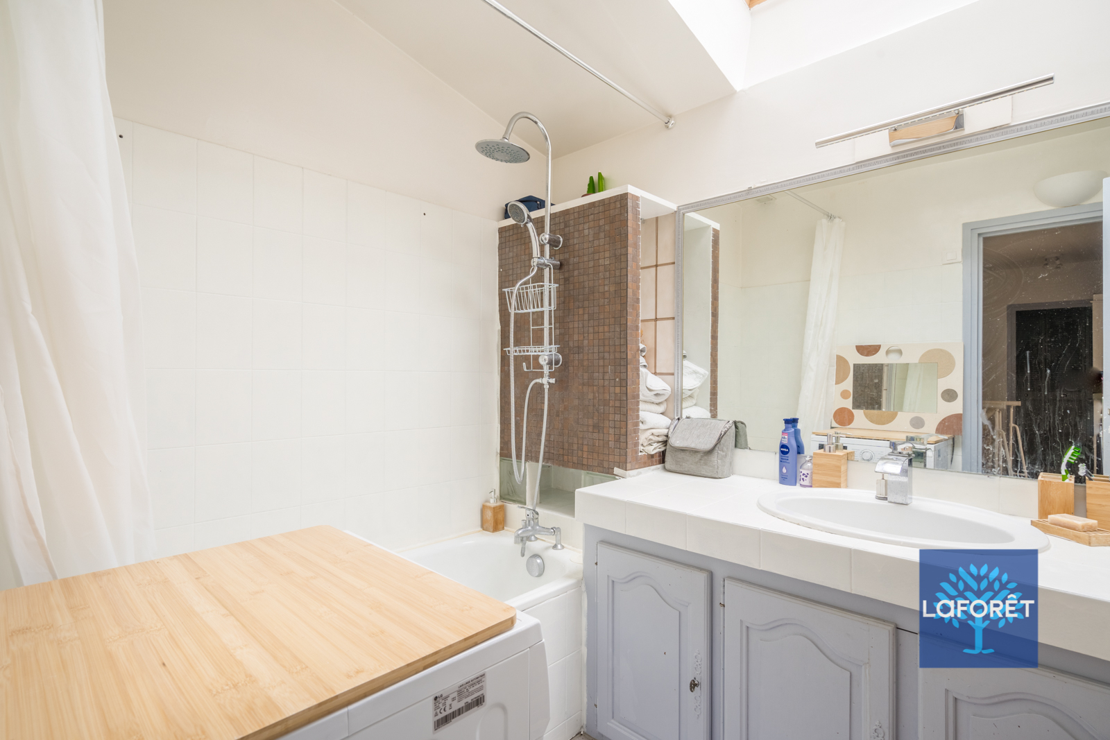 Appartement de 77 m² en duplex de type F3 comprenant au RDC: entrée, cuisine aménagée et équipée, séjour donnant sur une terrasse et un jardin de 50 M², un wc. Au 1 ier étage: un grand palier avec bibliothèque deux chambres avec placards donnant sur un balcon, un dressing, une salle de bains, un wc.