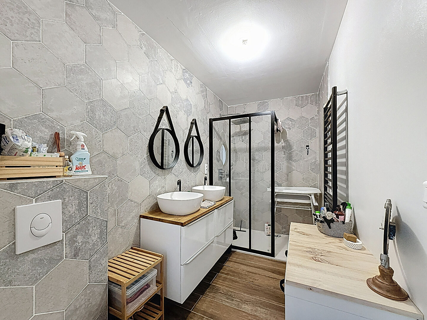 A l'étage, trois chambres, deux WC, deux salles d'eau, ainsi qu'une grande pièce avec cuisine et salon.