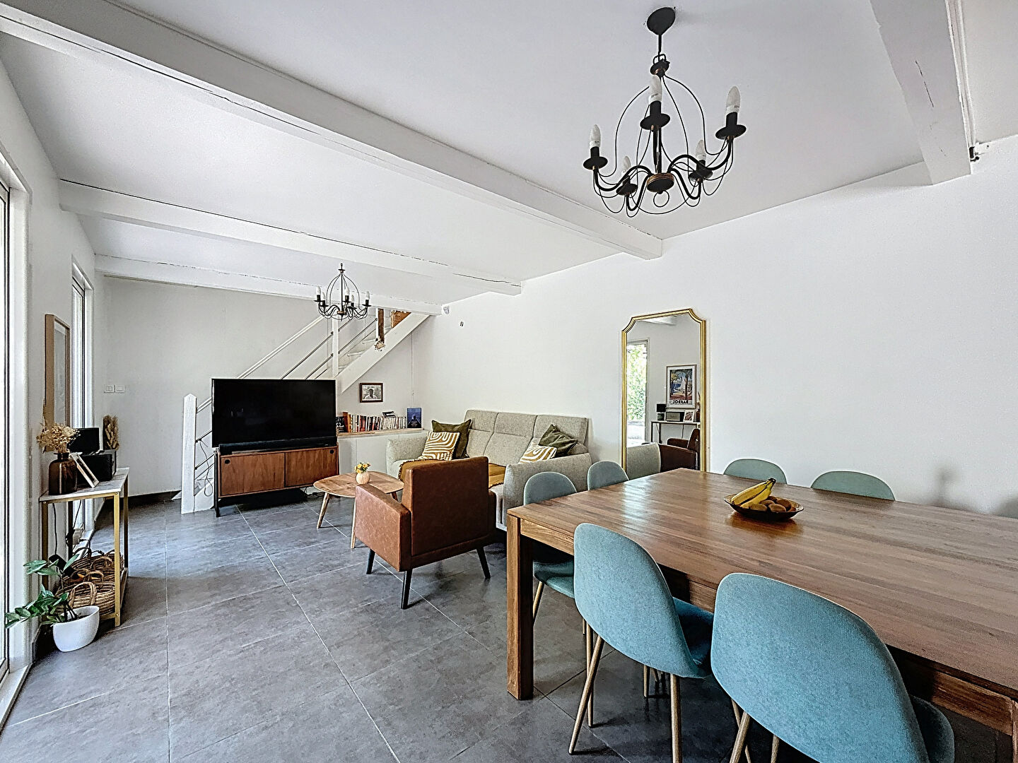 La maison répartie sur deux niveaux de vie offre au RDC une grande pièce de vie de 40m² env . avec cuisine ouverte donnant sur une grande terrasse et le jardin.