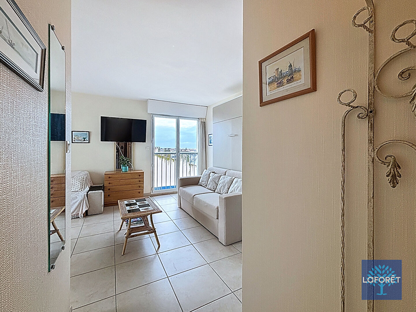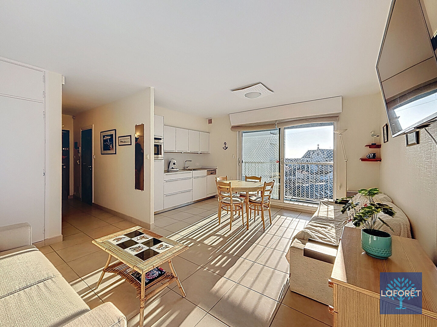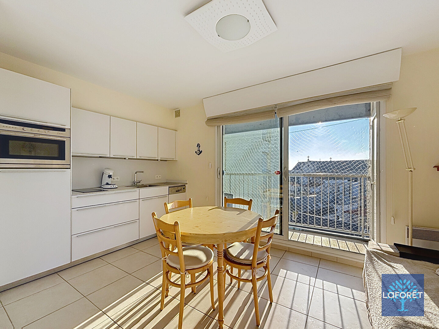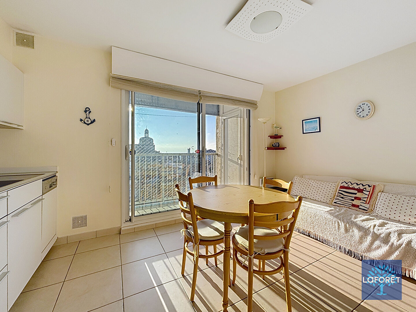 Sa pièce de vie avec cuisine ouverte a l'atout d'avoir deux ouvrants au sud et à l'ouest permettant au soleil de s'inviter sur les beaux jours. La terrasse prolonge la salle à manger et offre une vue dégagée avec un aperçu mer tandis que l'ouvrant côté ouest offre une belle vue sur le port de pêche. Deux placards intégrés et une salle d'eau avec wc complètent l'appartement.