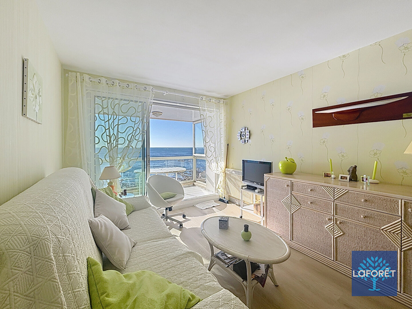 A l'extérieur, un balcon/ terrasse offrant une vue dégagée sur l'horizon et sur la baie des Sables d'Olonne.