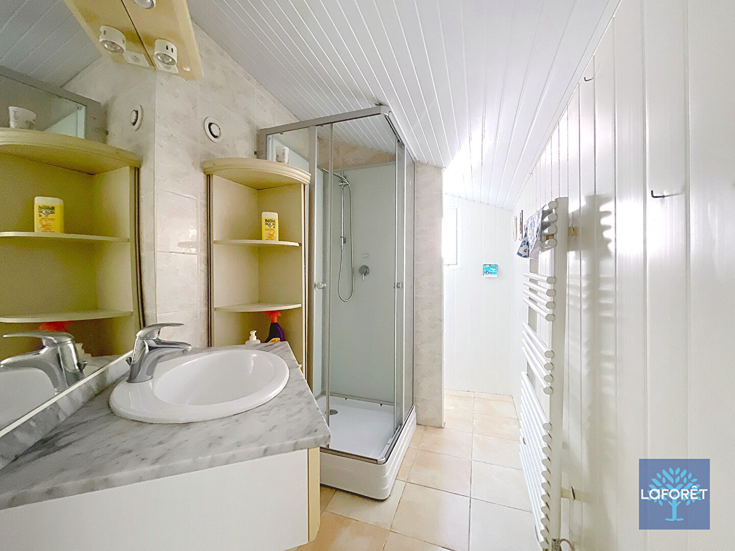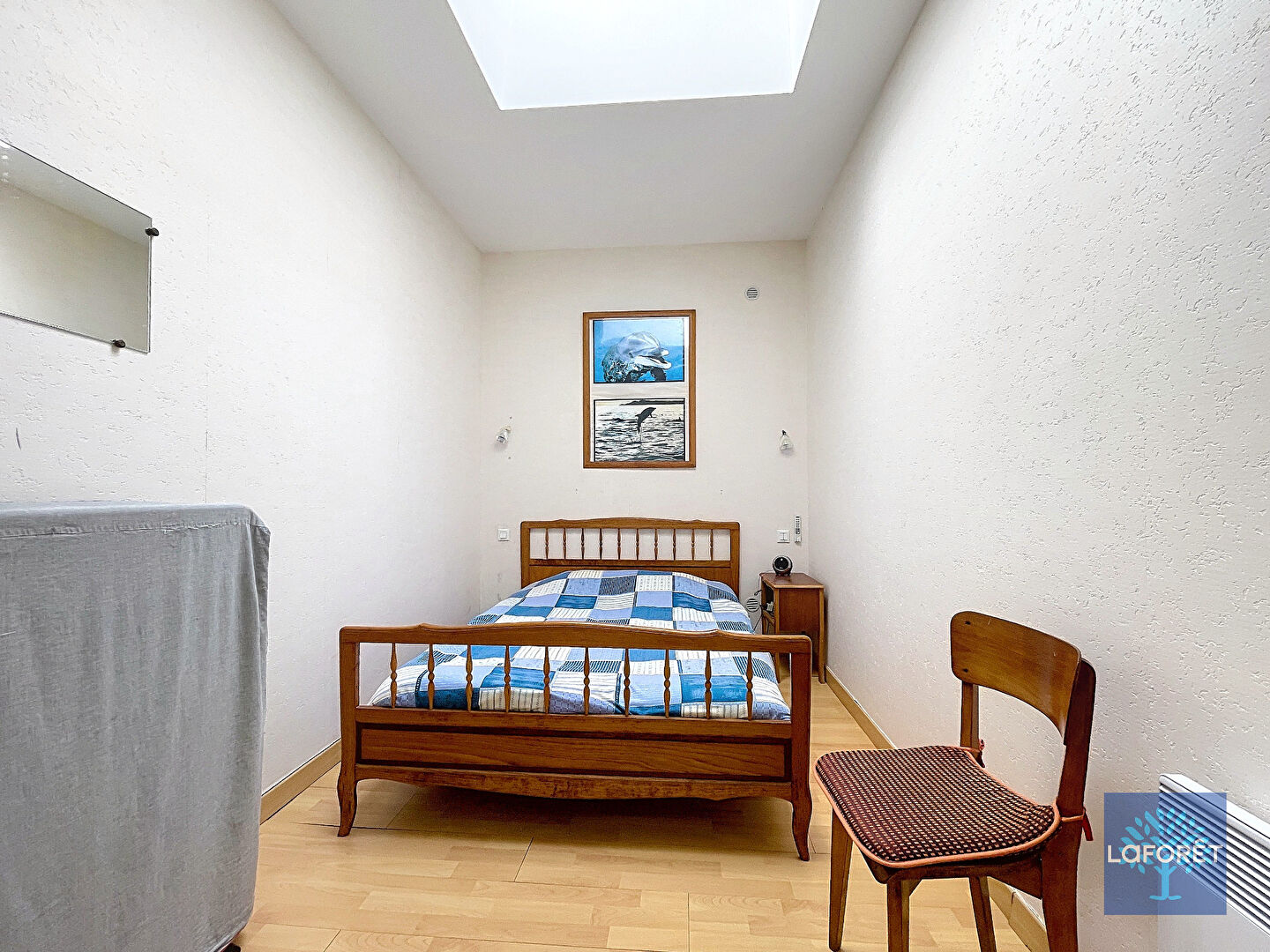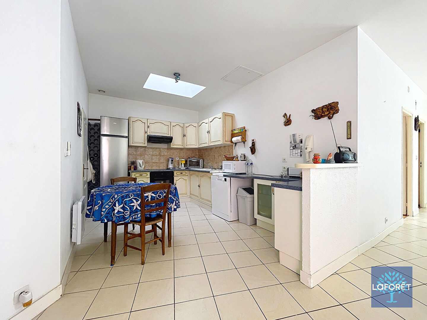 Elle se compose d'une grande pièce de vie lumineuse de 50m² avec cuisine aménagée et équipée donnant sur un extérieur, deux chambres et une salle d'eau avec WC. Côté pratique, un garage attenant à la maison.
