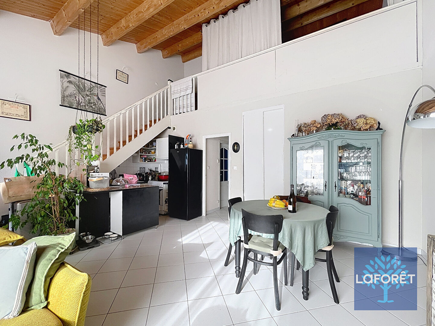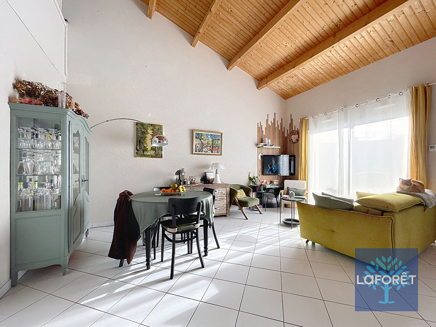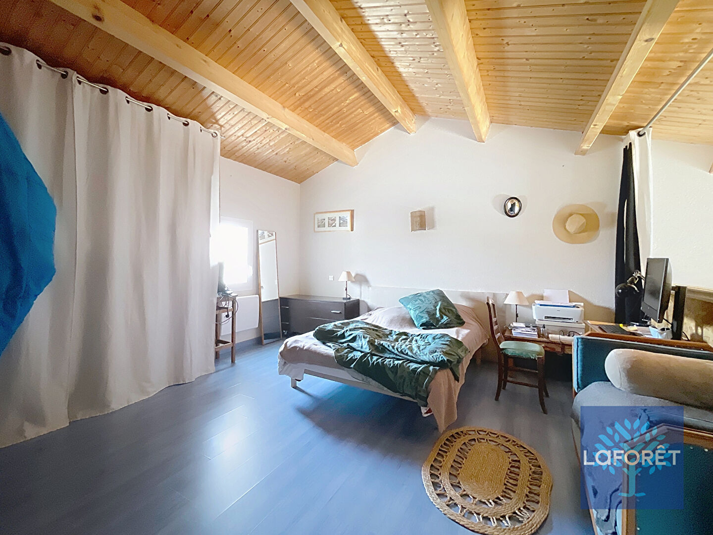 Au rez-de-chaussée, un salon-séjour lumineux de 30 m² avec cuisine ouverte, une chambre avec placard, une salle d'eau avec wc, une buanderie et une véranda. À l'étage, une grande pièce de 18 m² pouvant faire office de seconde chambre, une salle d'eau et un WC.