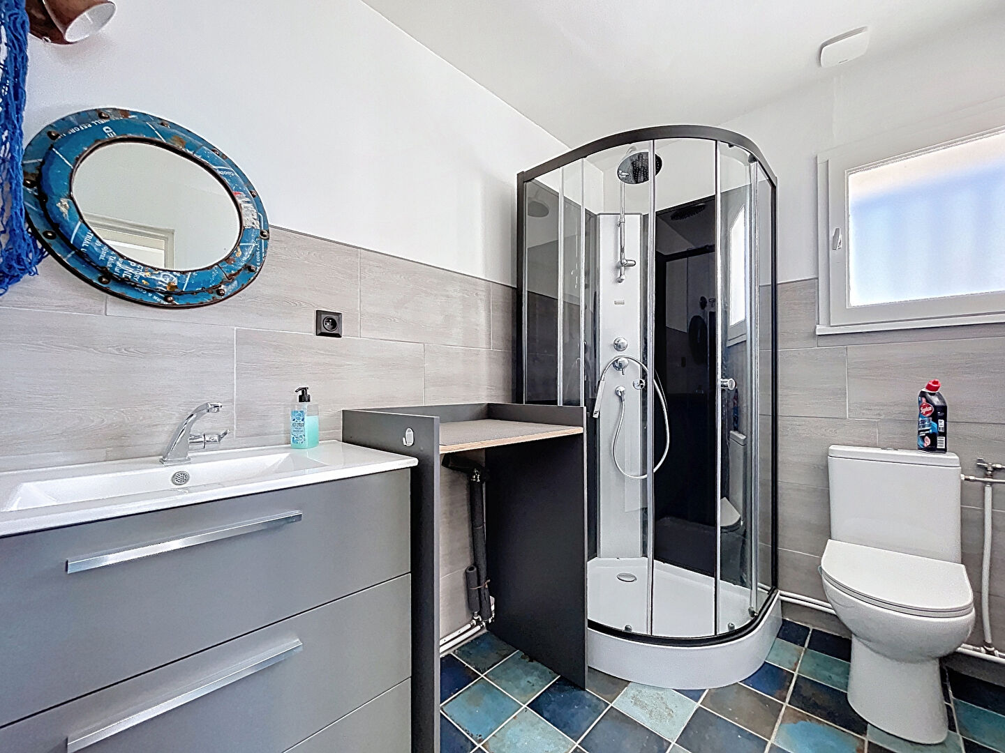 Elle comprend, au rez-de-chaussée, une pièce de vie orientée sud avec un poêle à bois, une cuisine aménagée/équipée et une salle d'eau avec wc.