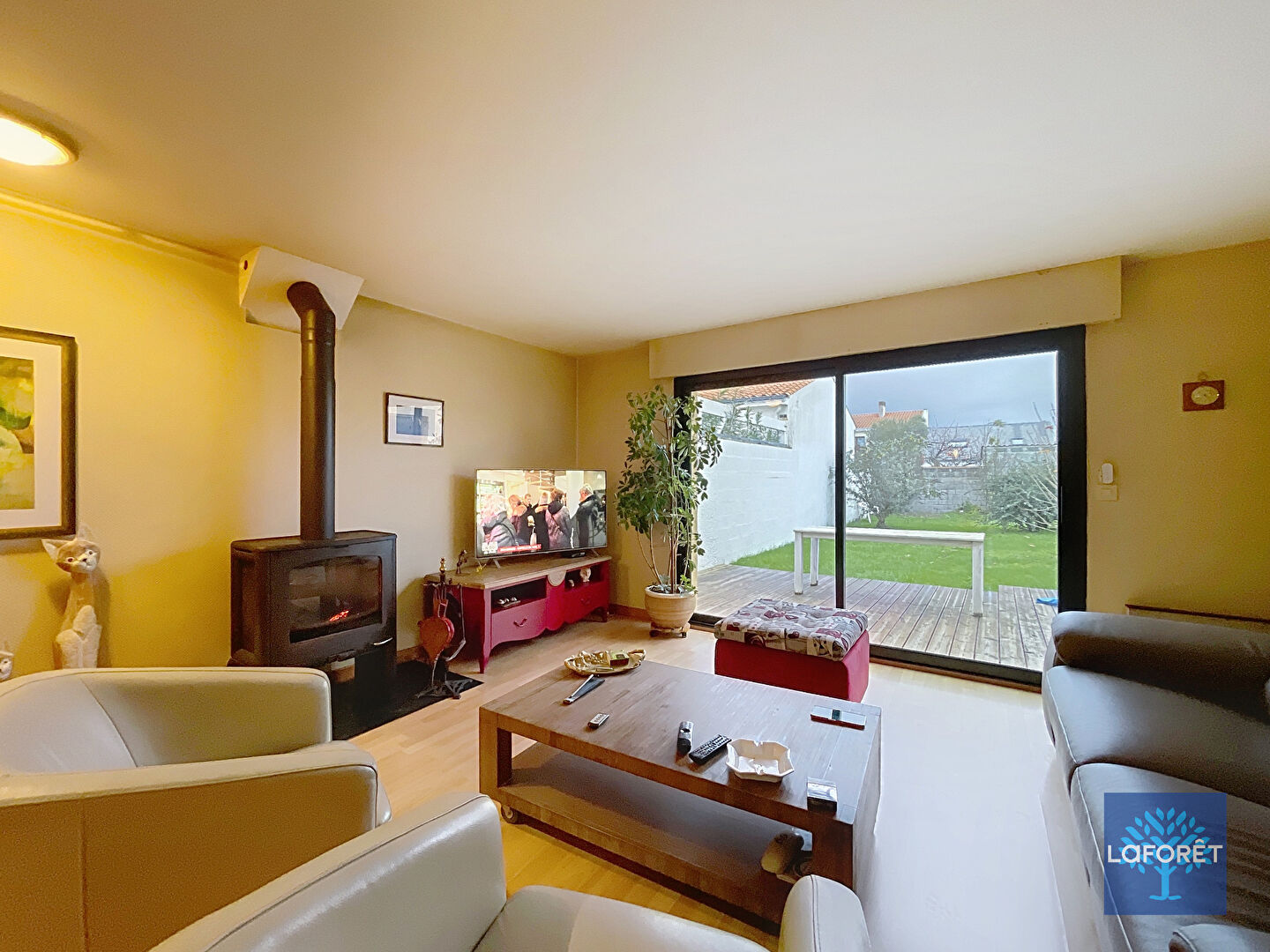 Devant la maison, du stationnement privatif. A l'arrière, un beau jardin arboré à l'abri des regards.