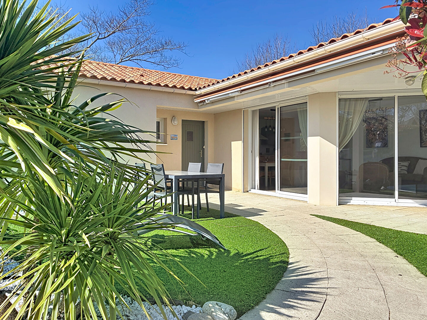 La maison est de plain-pied, composée d'un beau séjour avec de grandes baies ouvrant sur terrasse, cuisine aménagée et équipée, 3 chambres, salle de bains avec bains et douche, local de rangement et dépendance chauffée.