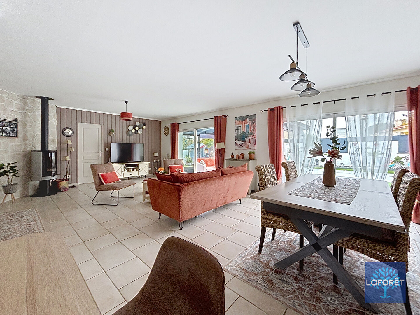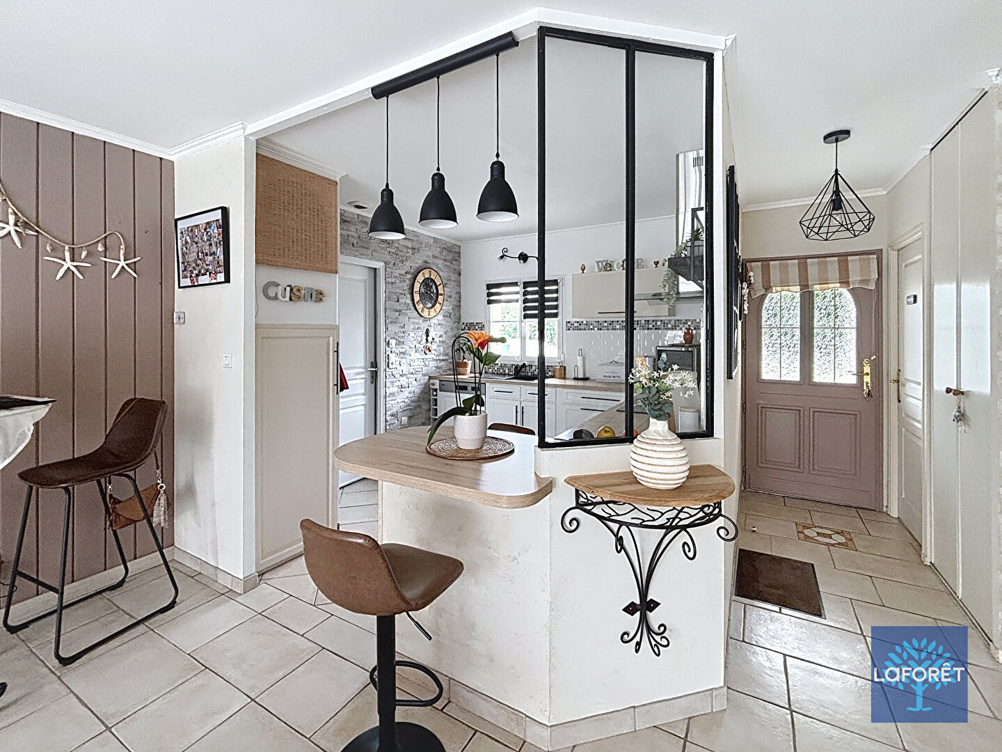 Dès l'entrée, vous y trouverez de beaux volumes donnant sur la pièce de vie, l'ambiance y est chaleureuse grâce à son poêle à bois. La cuisine équipée complète cette belle partie vie.