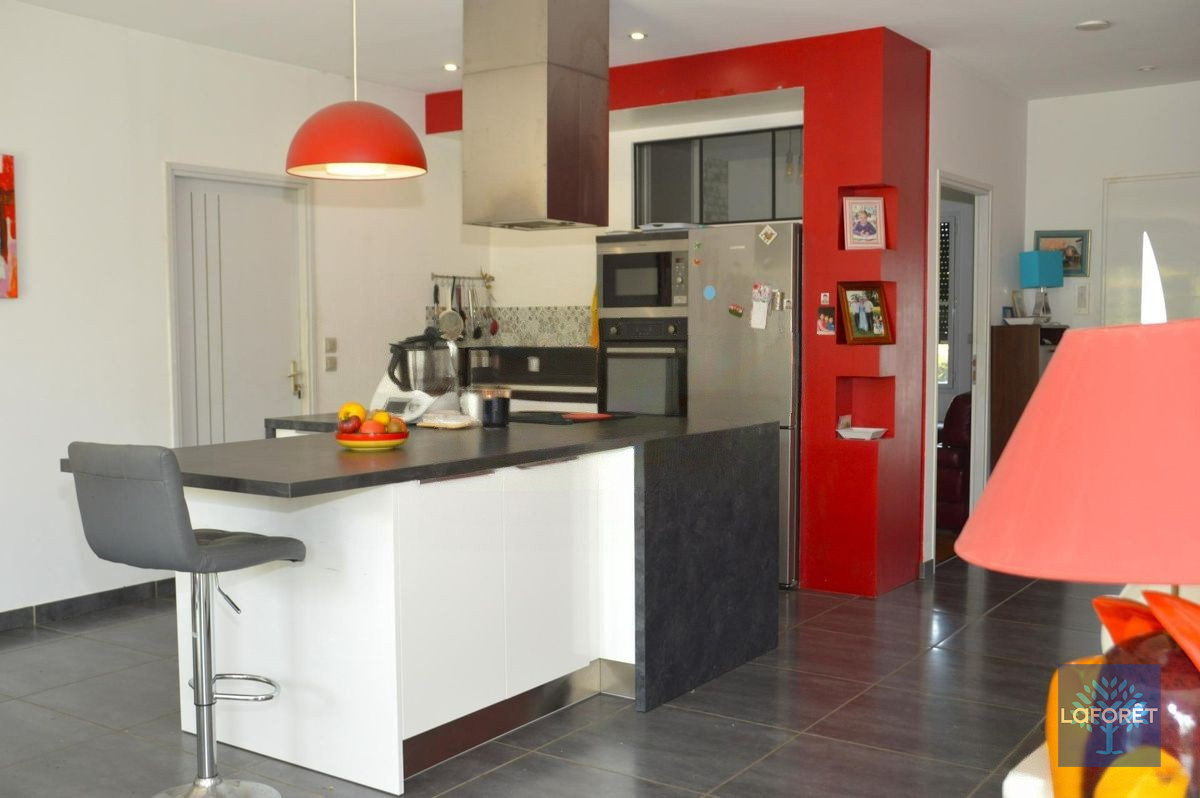 Elle se compose d'une entrée, une grande pièce de vie lumineuse avec poêle à bois, une cuisine aménagée et équipée, une suite parentale avec salle d'eau et dressing, un bureau, trois chambres, une salle d'eau, deux wc et un double garage.
