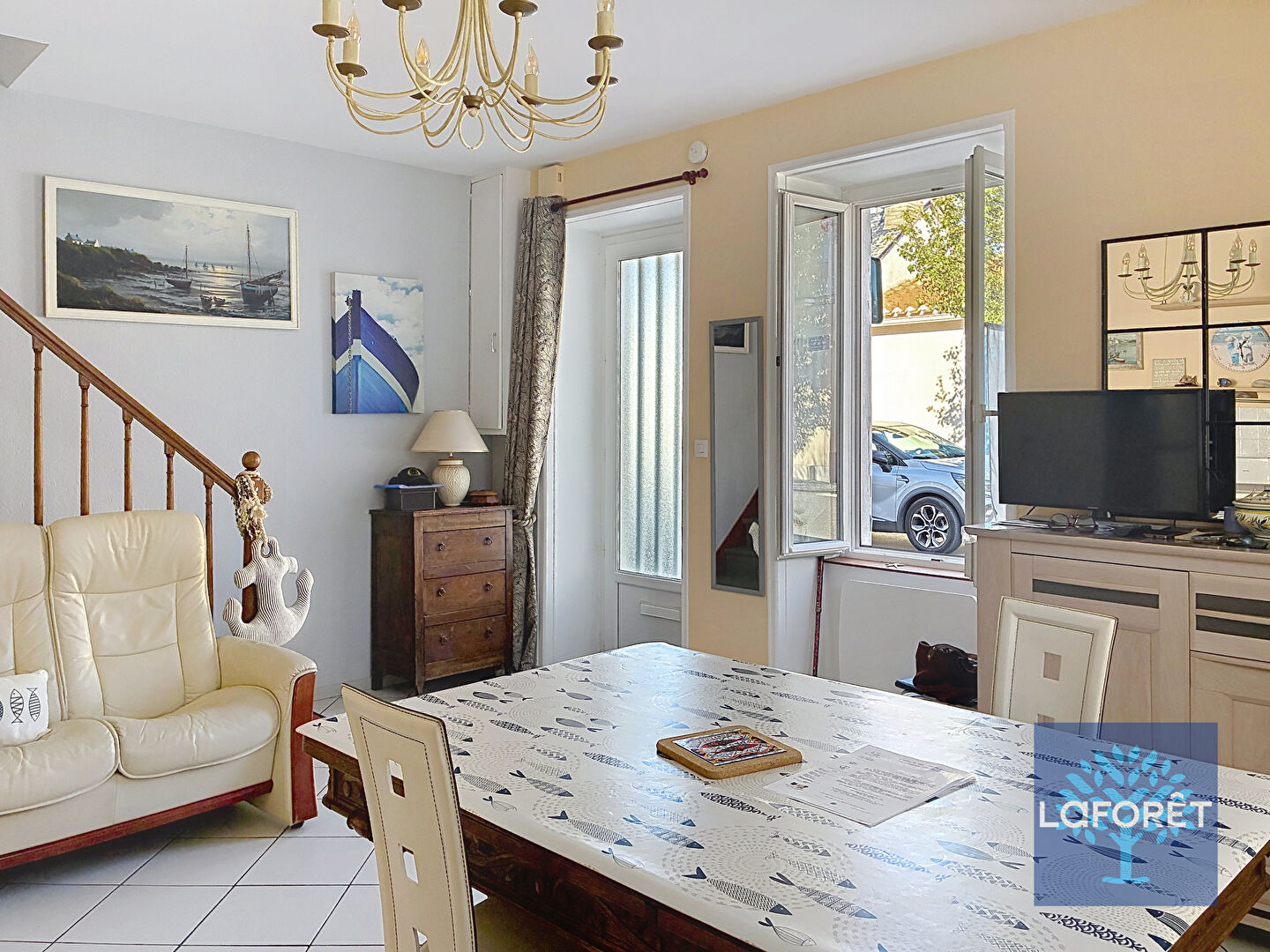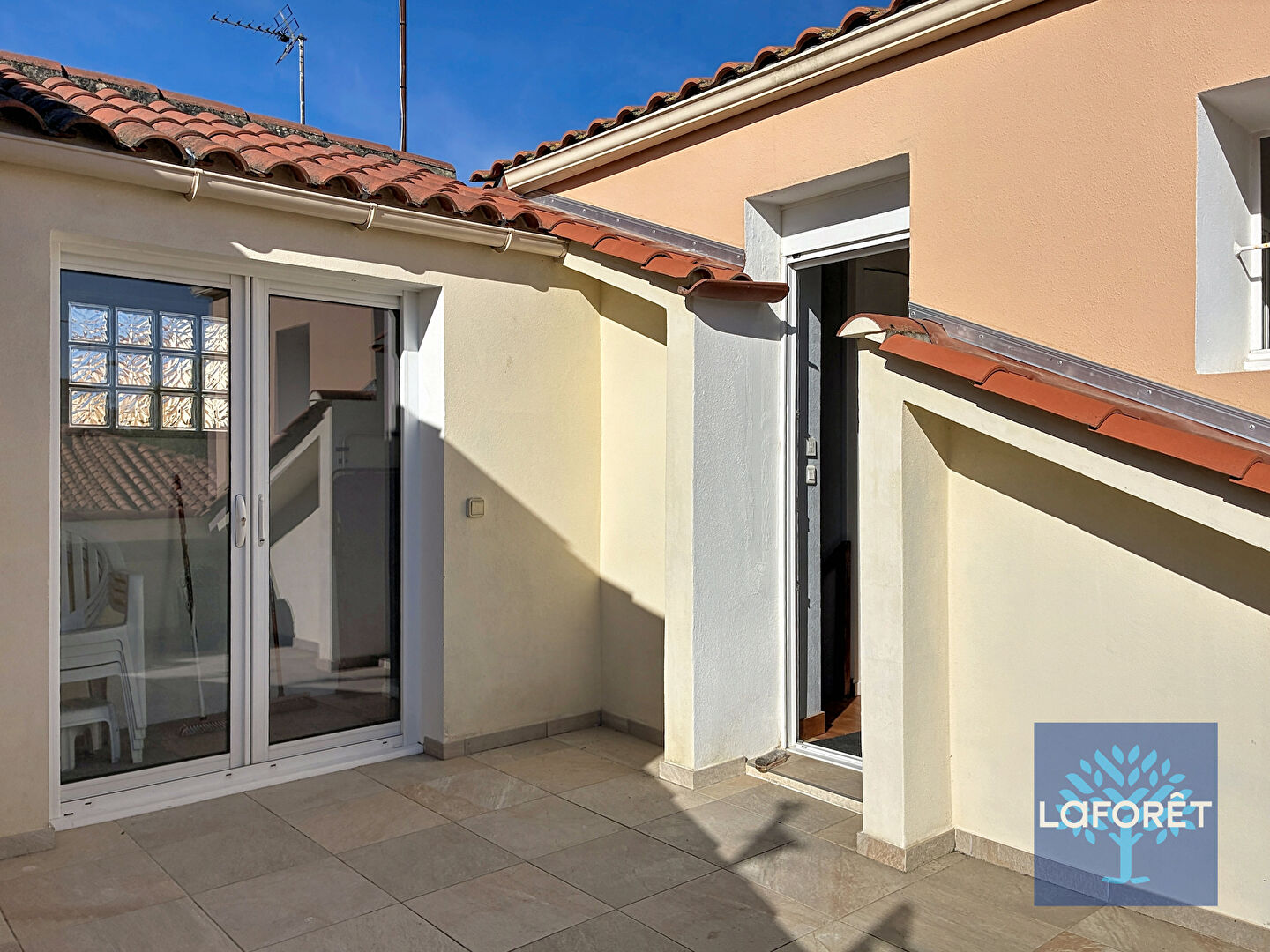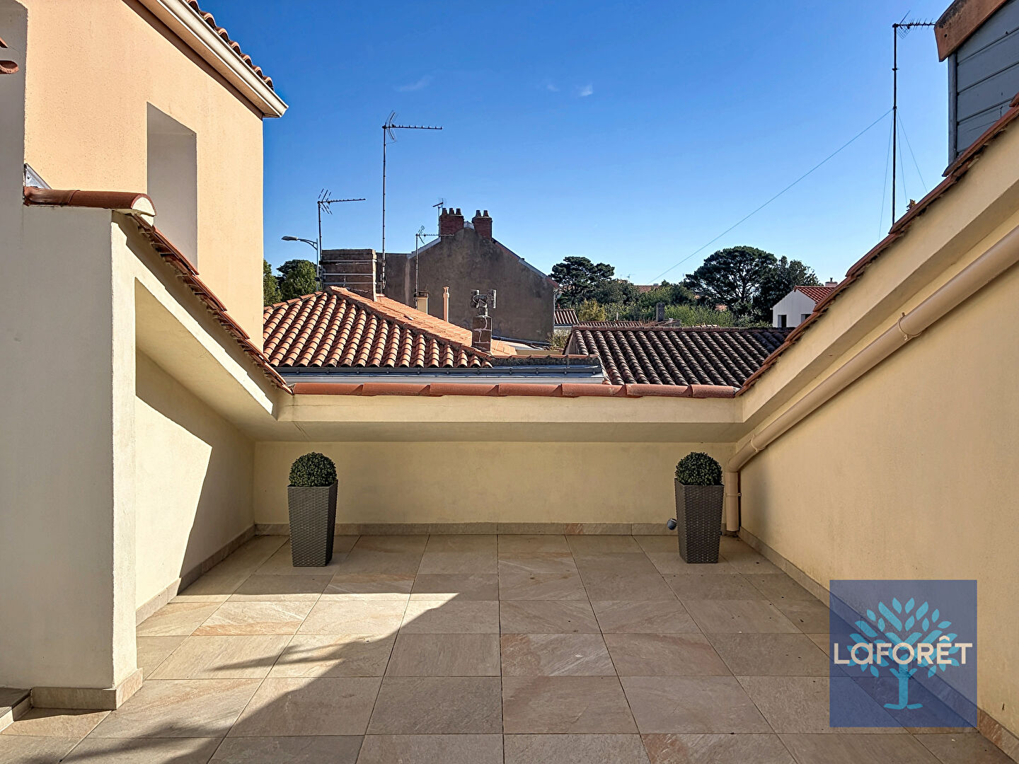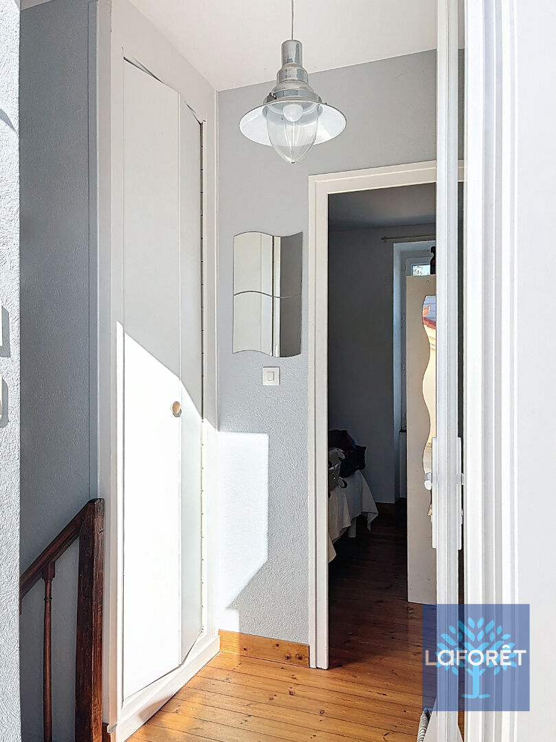 A l'étage : deux chambres, penderie, salle d'eau avec wc, une belle terrasse à l'abri des regards.