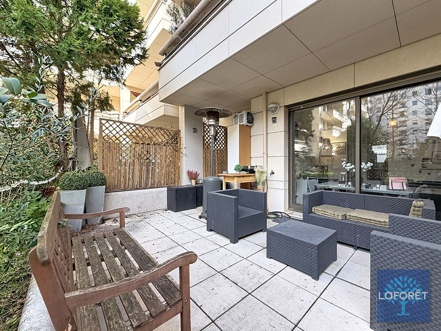Bien agencé, il comprend un bel espace de vie avec accès direct à sa terrasse donnant sur le jardin de la copropriété, une cuisine aménagée et équipée, deux chambres avec rangement, un bureau ou coin nuit, salle de bains et wc séparés.