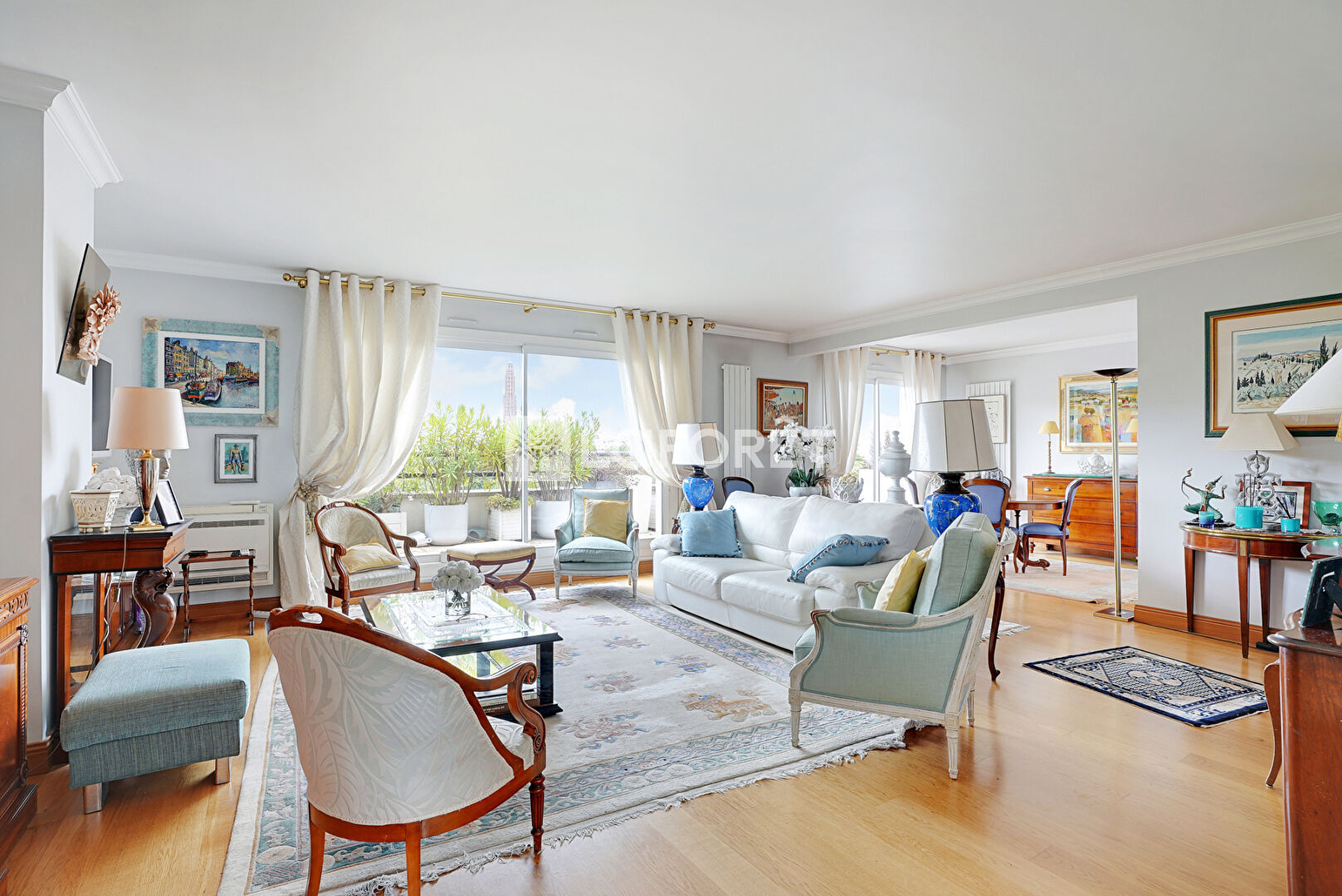 Un vaste séjour avec salle à manger (possibilité d'une 4ème chambre) qui s'ouvre sur une magnifique terrasse de 20 m² exposée sud-est, une cuisine indépendante, trois chambres, dont deux avec accès à un balcon, Une salle de bains, une salle d'eau , 2 wc dont un séparés