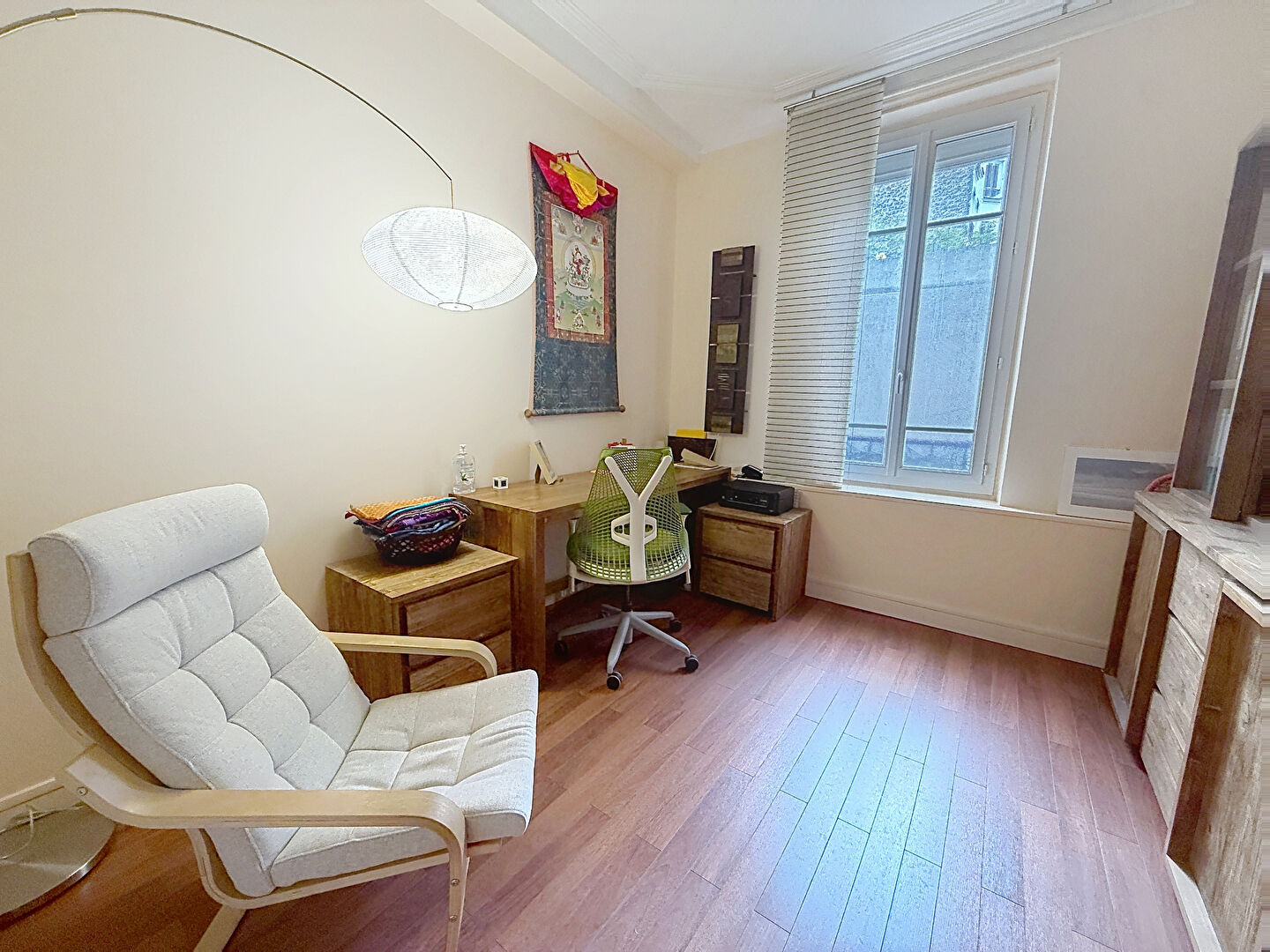 En Rez-de-chaussée : une pièce spacieuse idéale pour un bureau, un accueil chaleureux avec coin cuisine, et deux bureaux lumineux donnant sur cour. WC séparés pour plus de confort.