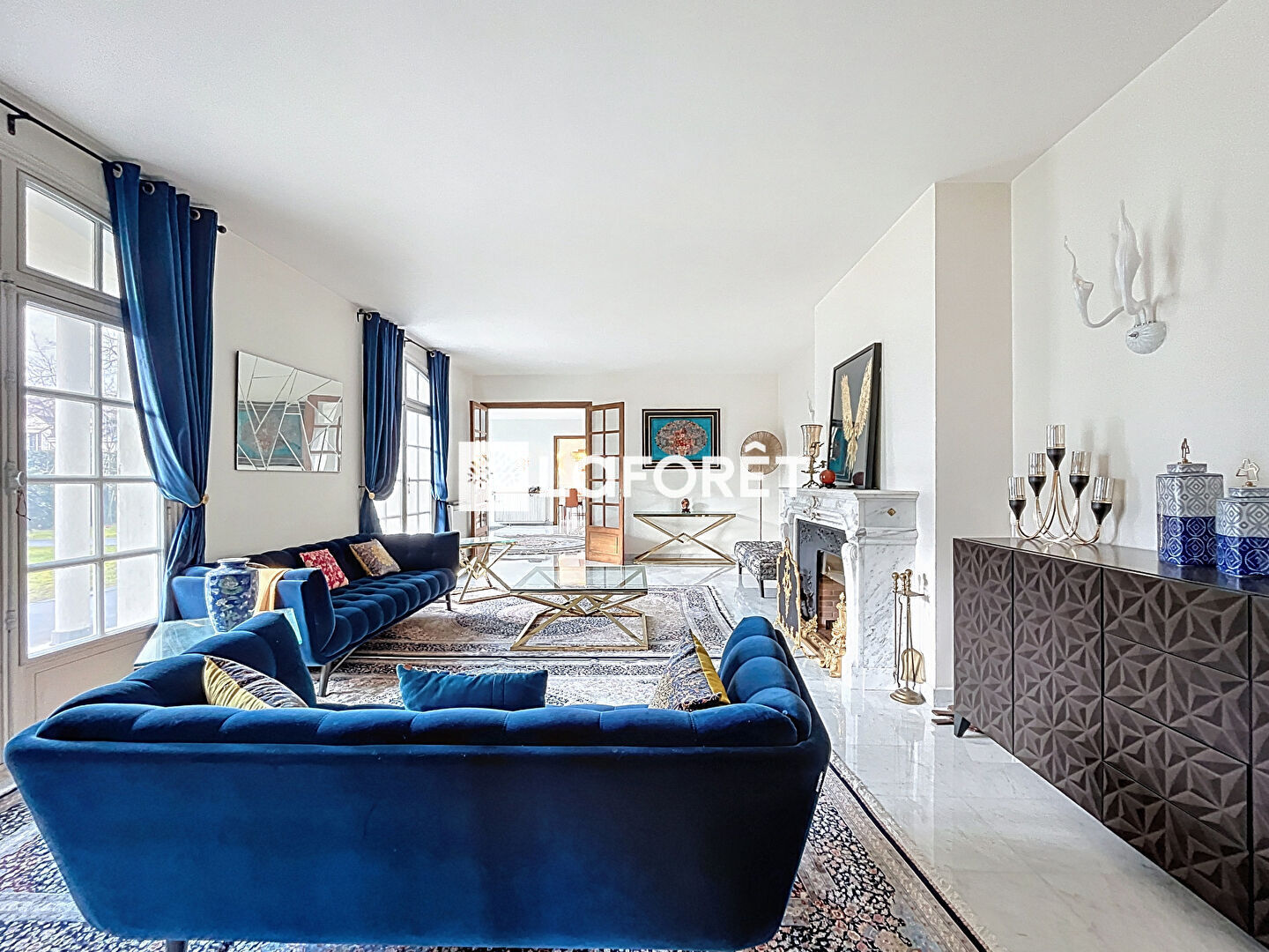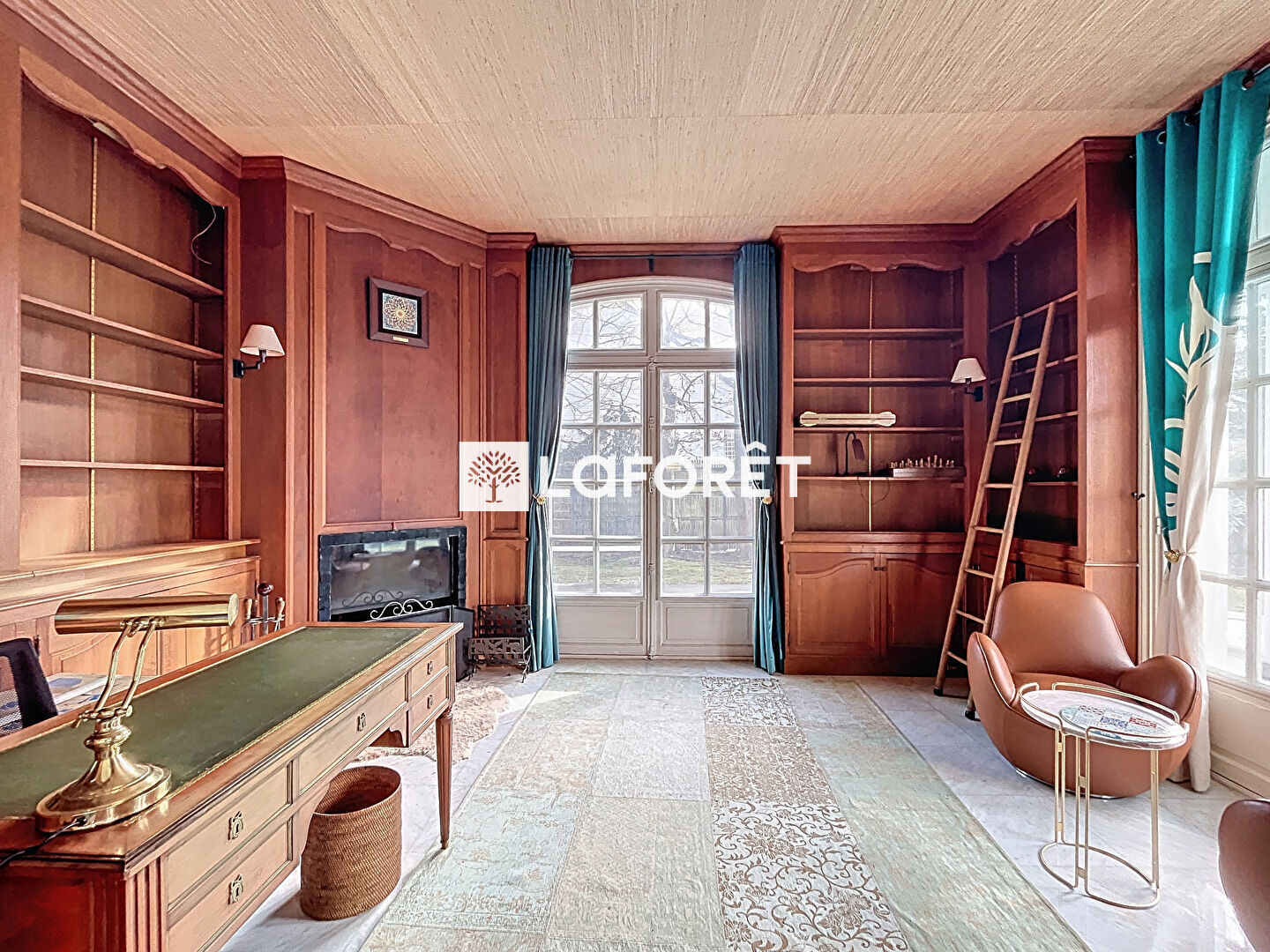 Dès l'entrée, une vaste galerie lumineuse révèle le caractère et le raffinement de la maison. Elle dessert une triple réception baignée de lumière avec cheminée, un salon-bibliothèque aux boiseries chaleureuses également agrémenté d'une cheminée, ainsi qu'une salle à manger dans le prolongement d'une cuisine indépendante entièrement équipée avec espace dinatoire.