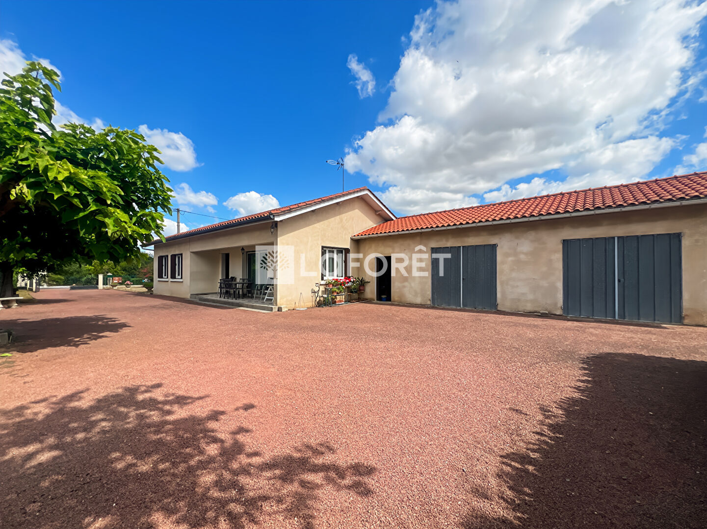 En extérieur vous y trouverez un double garage de plus de 40 m², pouvant servir de stockage. et d'une grande terrasse exposée plein sud.