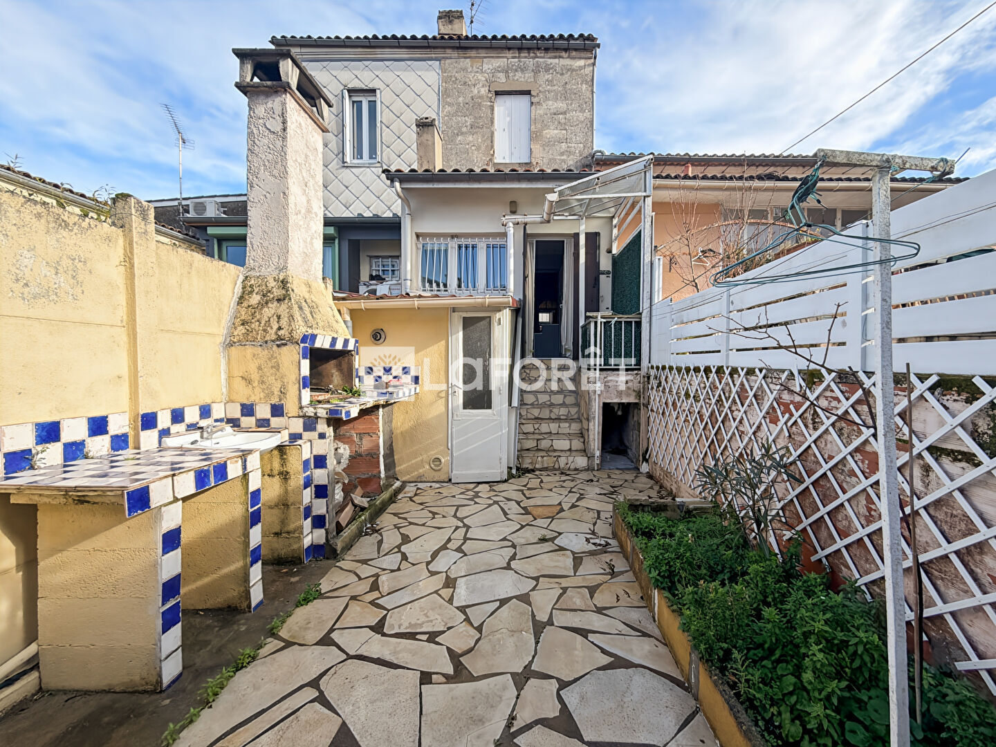 Elle se compose au rez-de-chaussée d'une chambre avec placard, un WC, d'une pièce de vie avec cuisine ouverte, le tout donnant accès à une cour avec une dépendance au fond de parcelle.