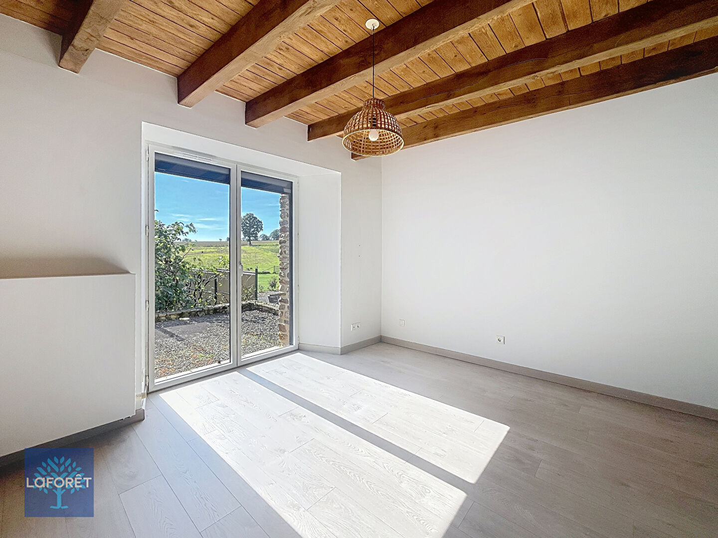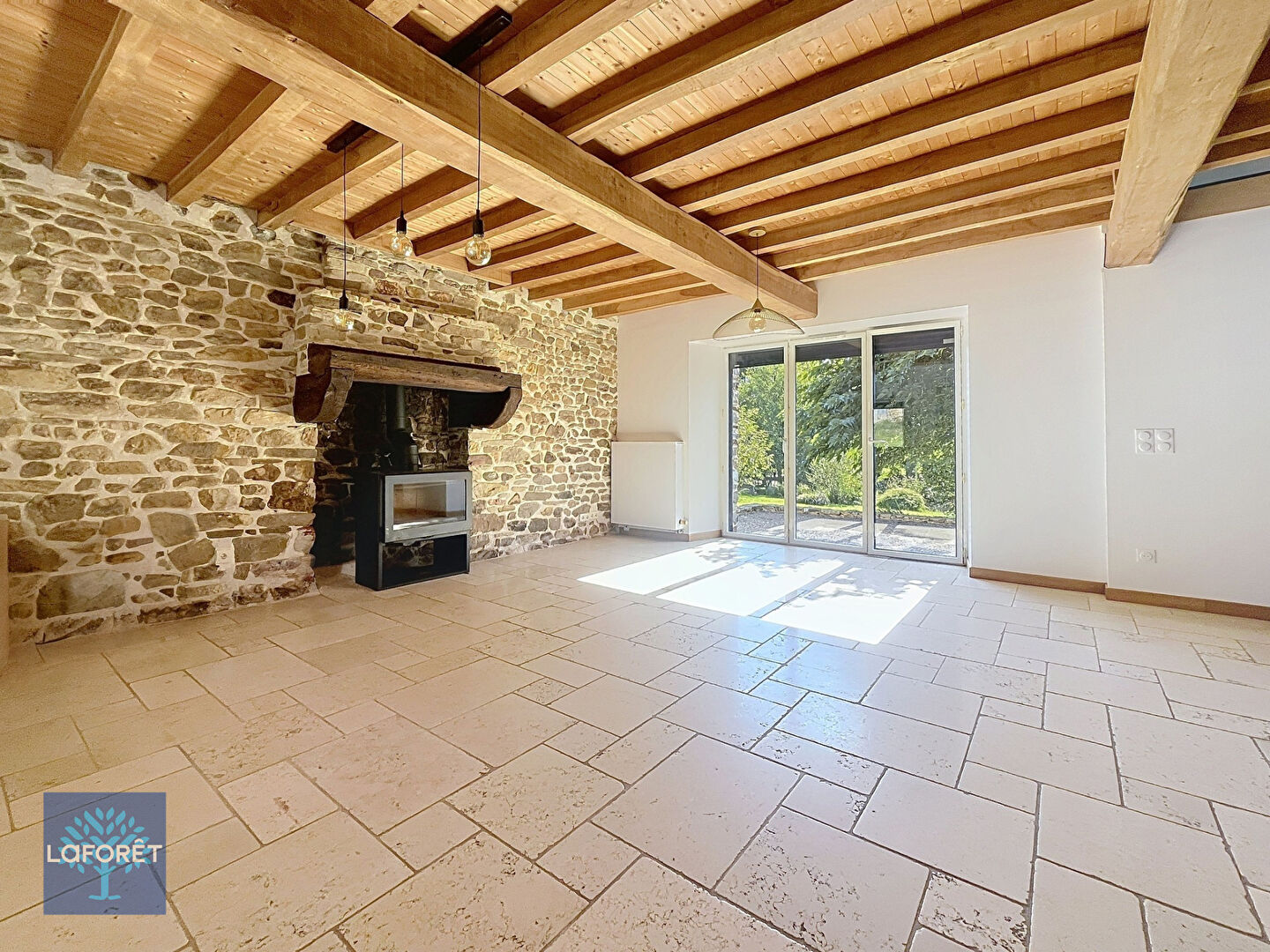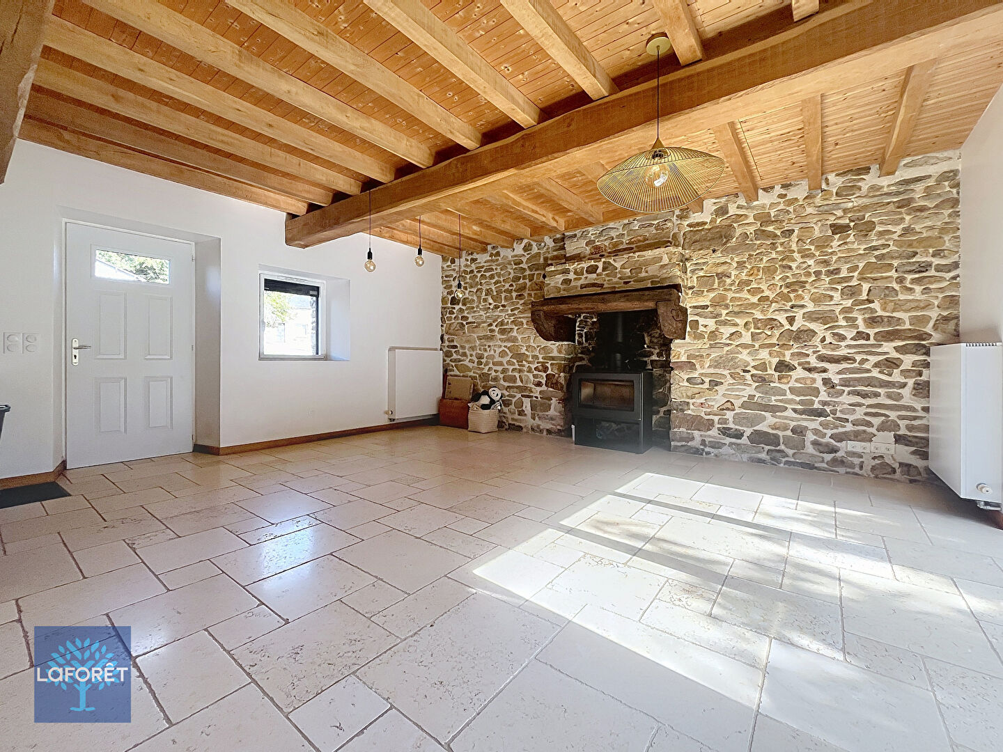 Une pièce de vie et cuisine chaleureuses, ouvertes sur la nature.