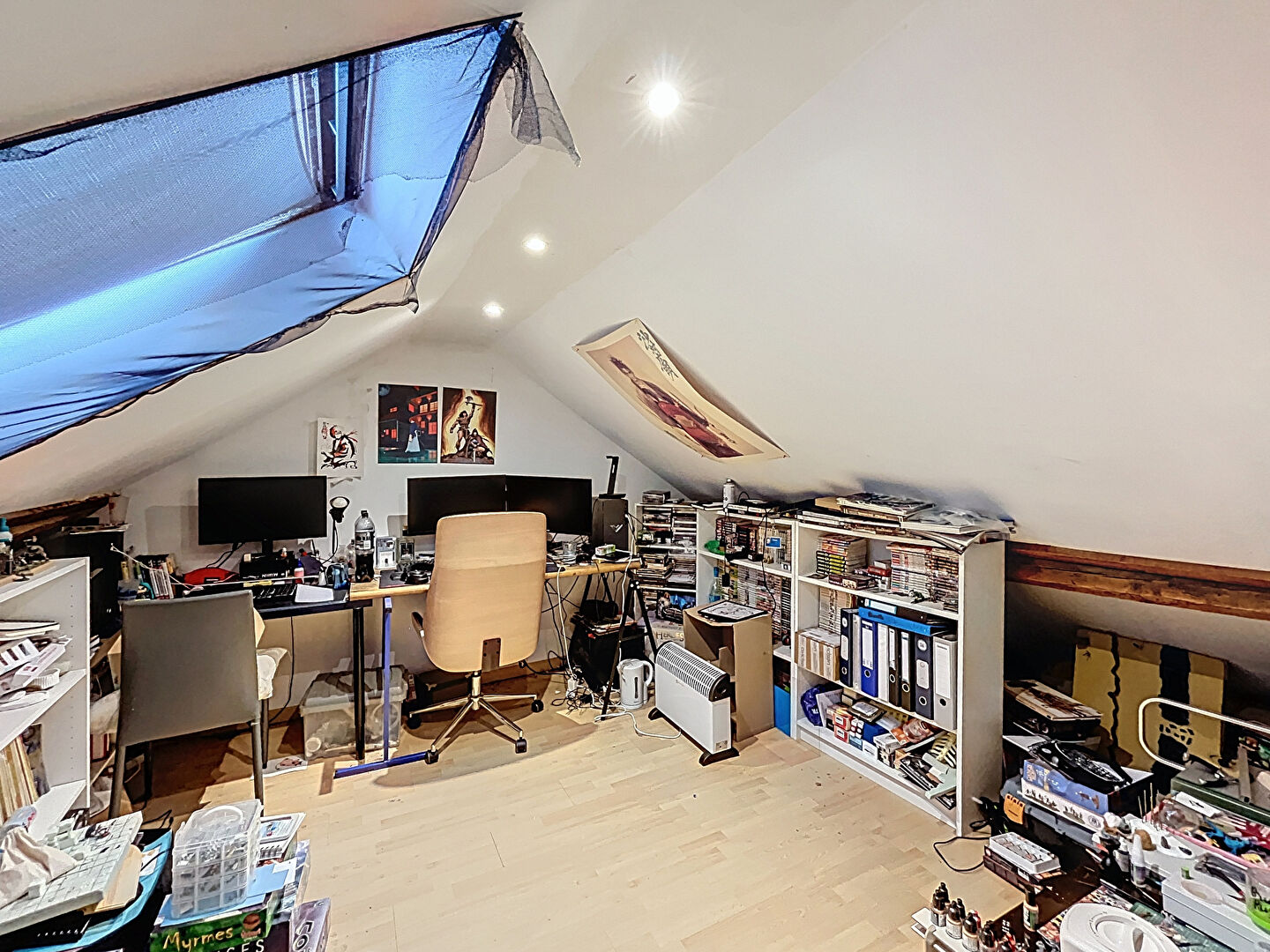 Aux étages, un palier dessert une salle de douche et deux chambres, tandis qu'une troisième chambre se situe au dernier niveau.
