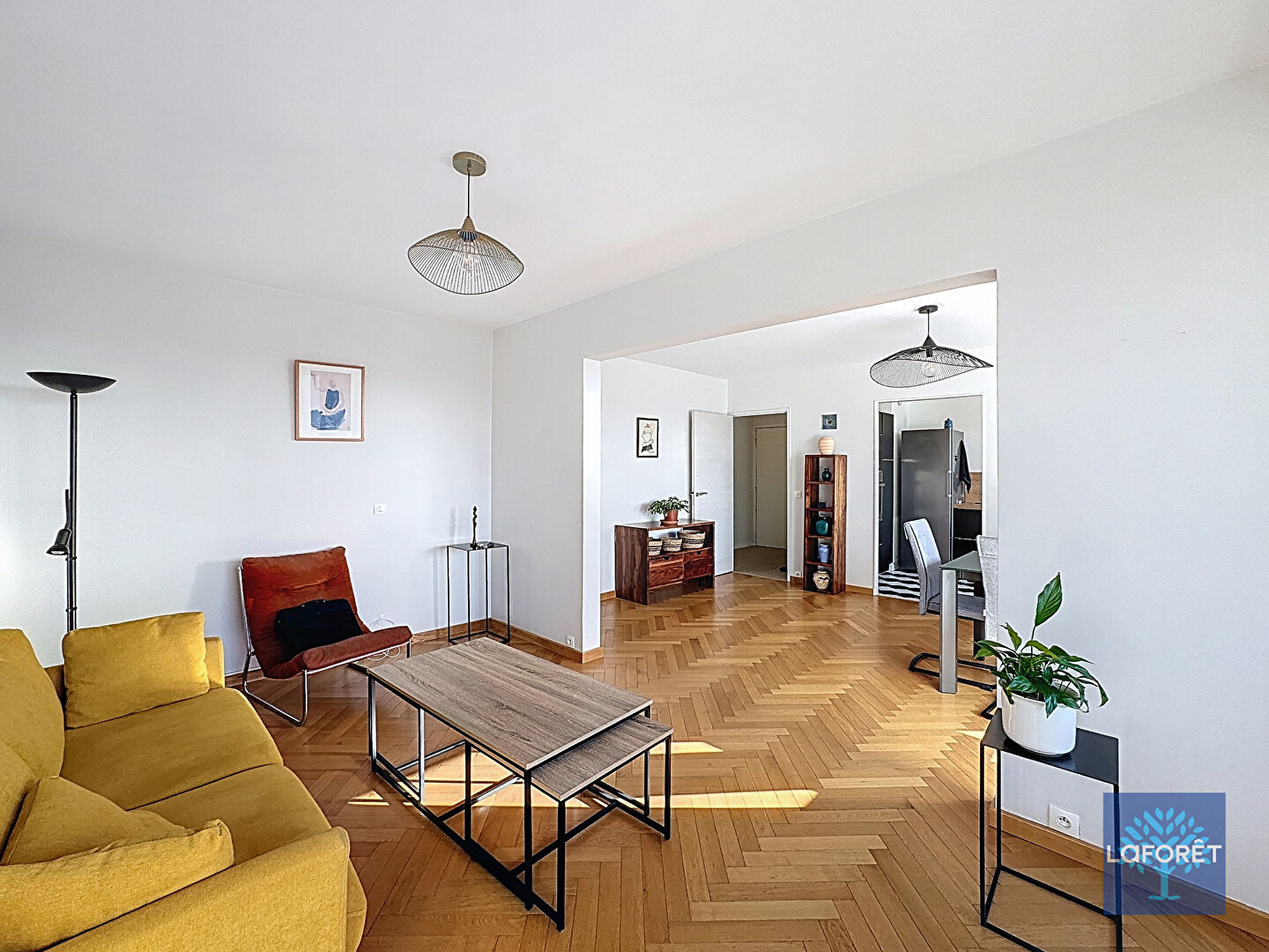 Le séjour parqueté de 32 m² s'ouvre sur un balcon, idéal pour profiter des beaux jours et prolonger l'espace de vie.