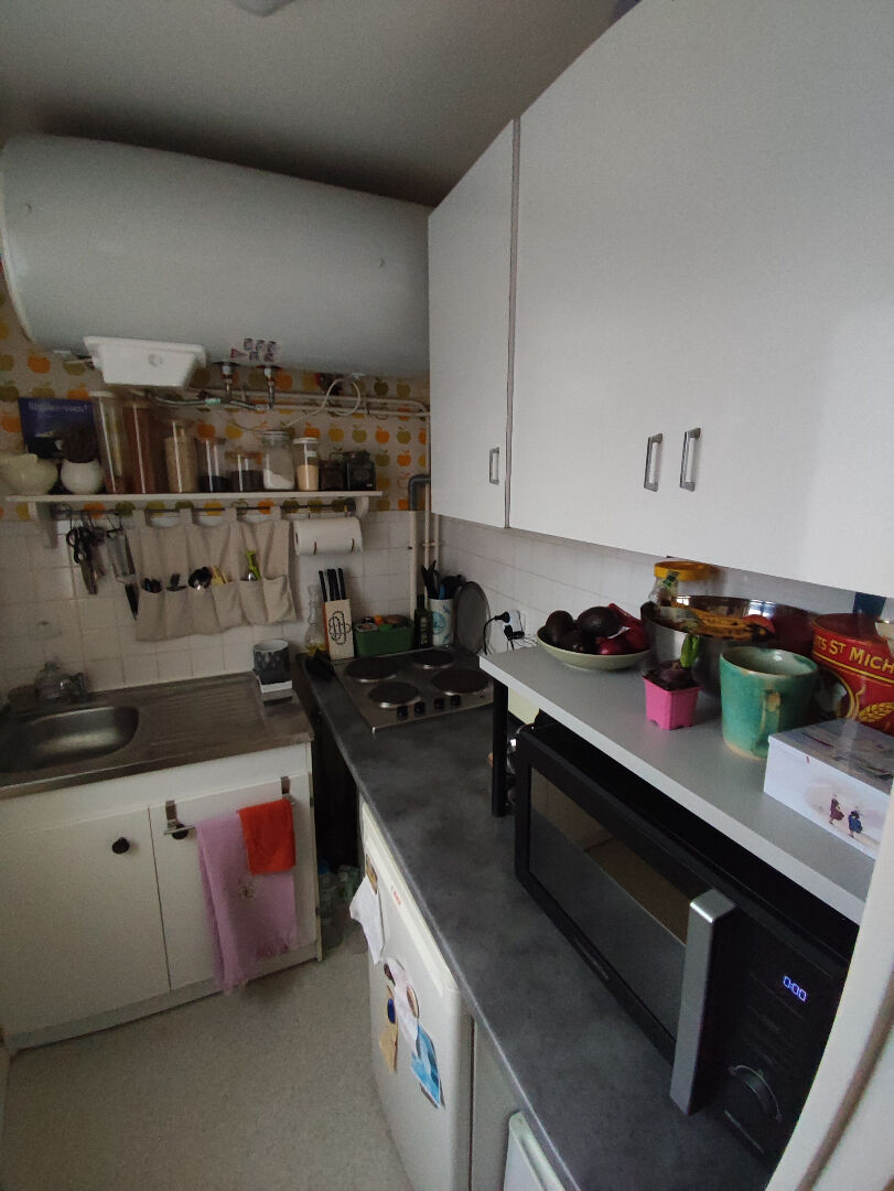 situé au 2e étage, il comprend une pièce principale avec coin nuit avec placard, une cuisine séparée aménagée et équipée de plaques de cuisson et d'un réfrigérateur, d'une salle de bains avec Wc, d'un balcon et d'une place de parking.