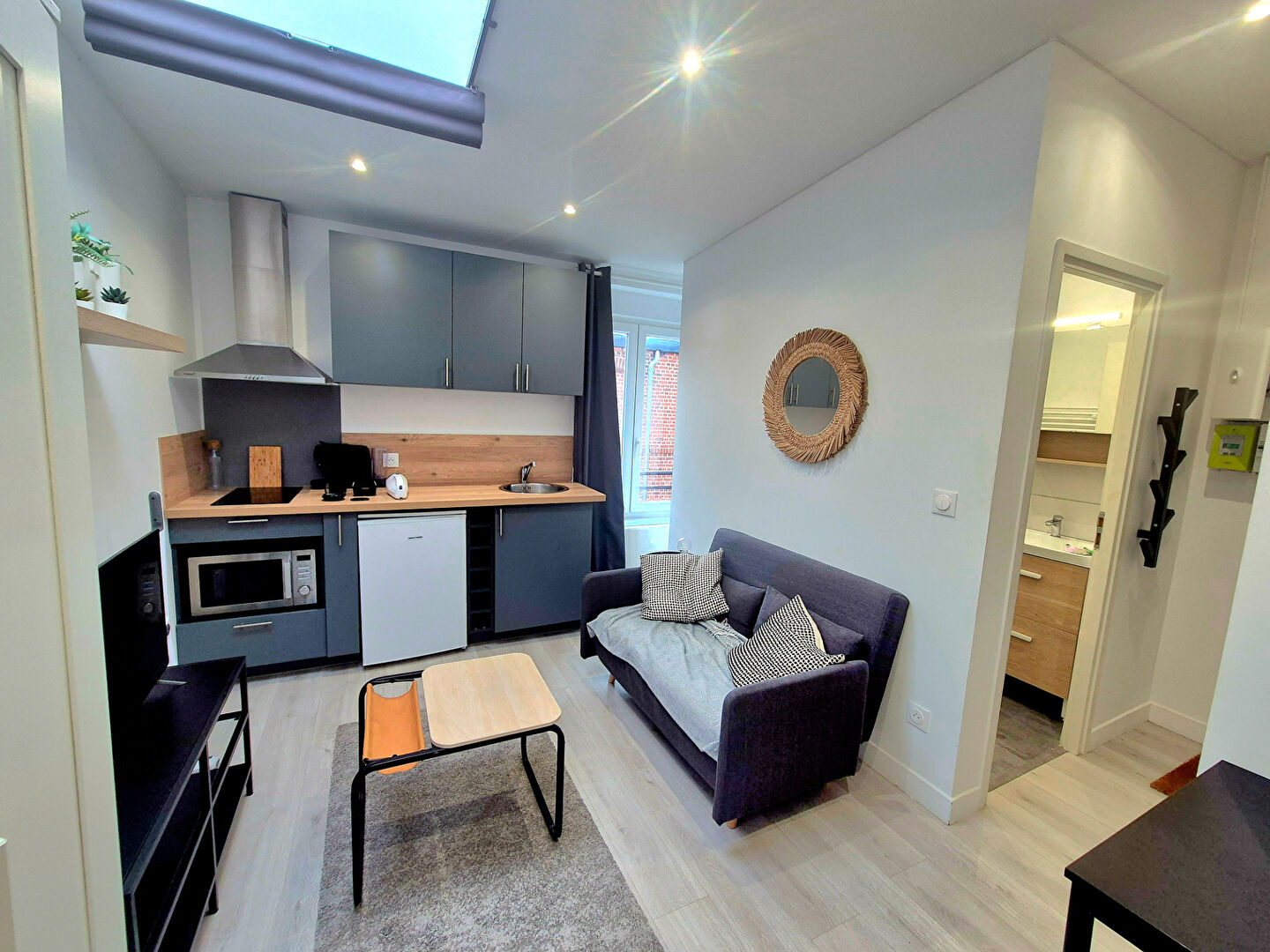 L'appartement entièrement refait à neuf et meublé comprend une entrée ouverte sur une pièce principale entièrement meublée ( canapé lit, coin Tv, armoire de rangement, table à manger) , une belle cuisine équipée (micro-ondes, plaques induction, hotte, kit vaisselle) et une salle d'eau avec WC.
