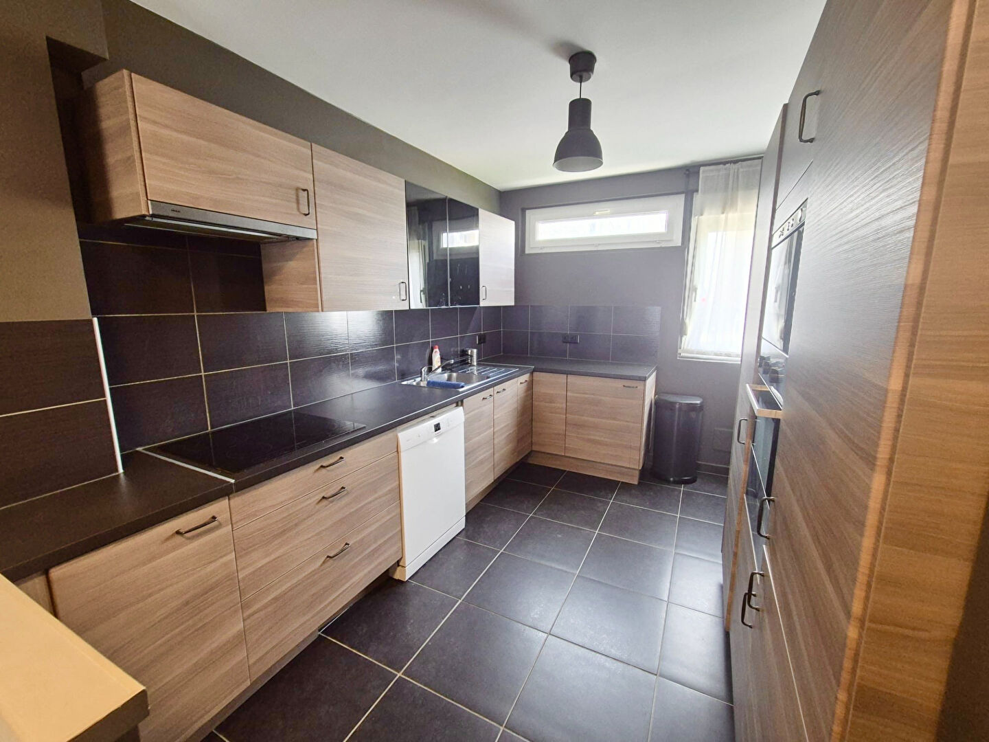 Cet appartement se compose d'une petite entrée avec rangements, d'une pièce de vie avec cuisine ouverte et équipée, trois chambres (une de 12m² et deux de 9m²) et une salle de bain avec WC séparé.